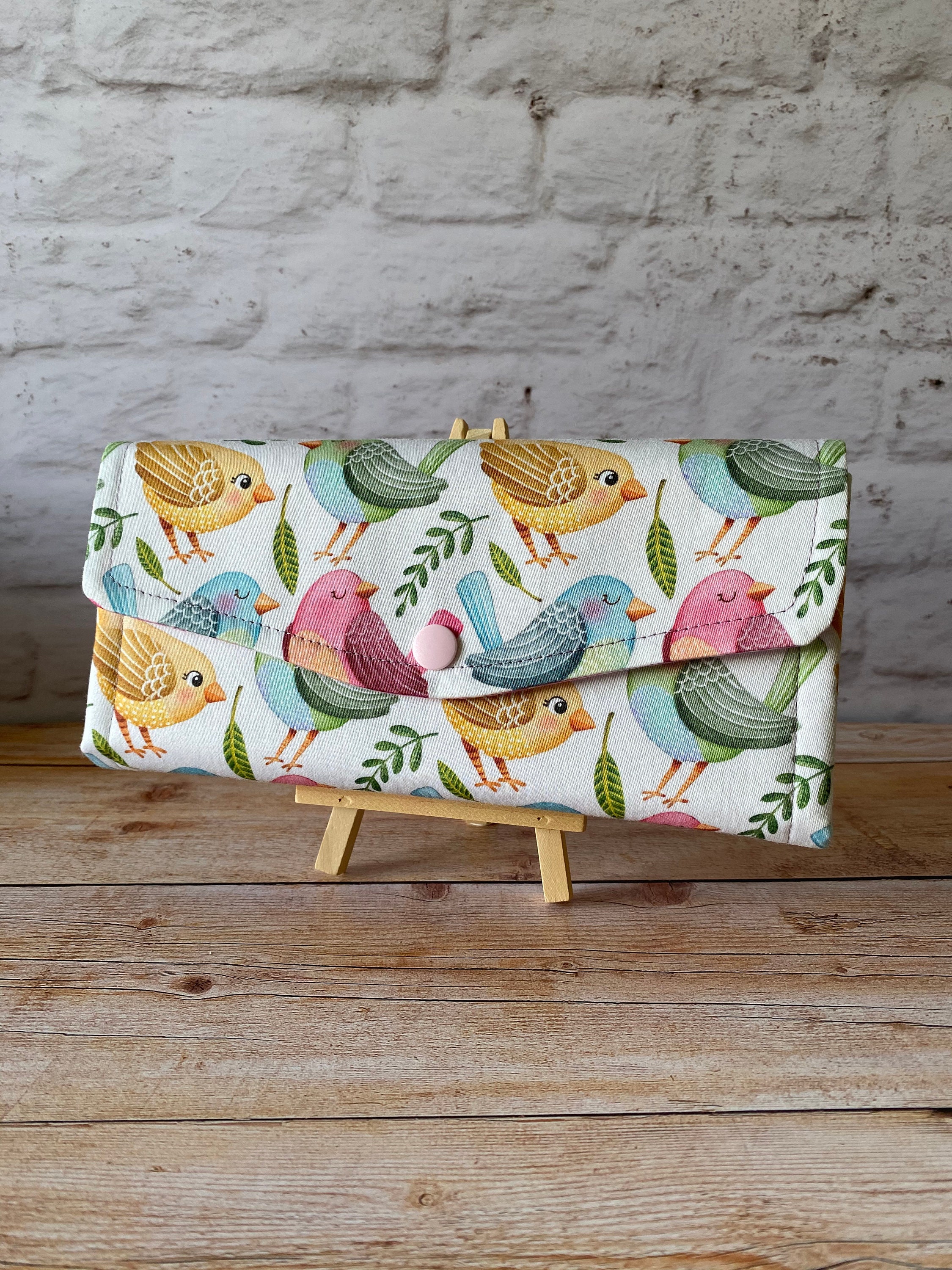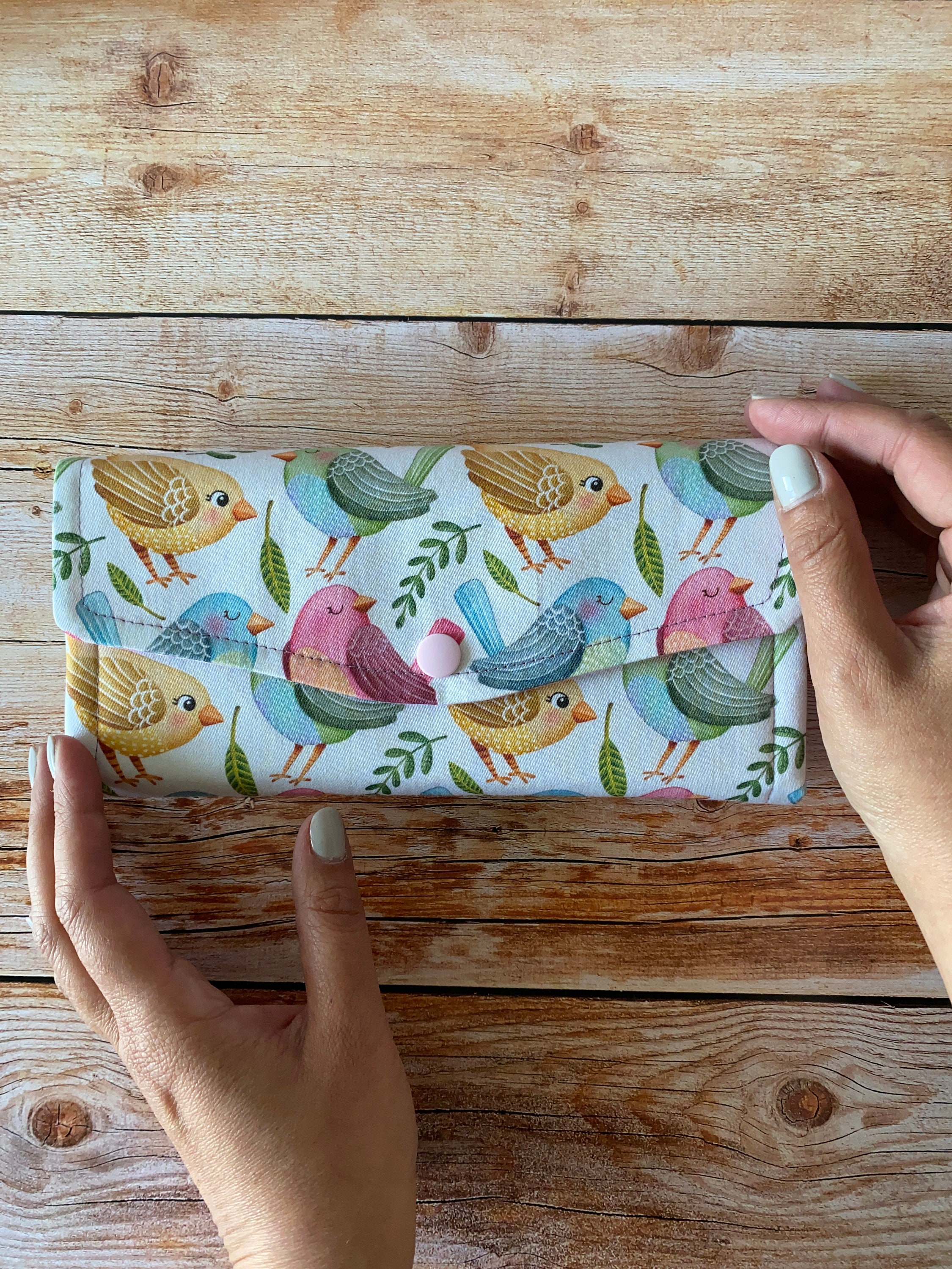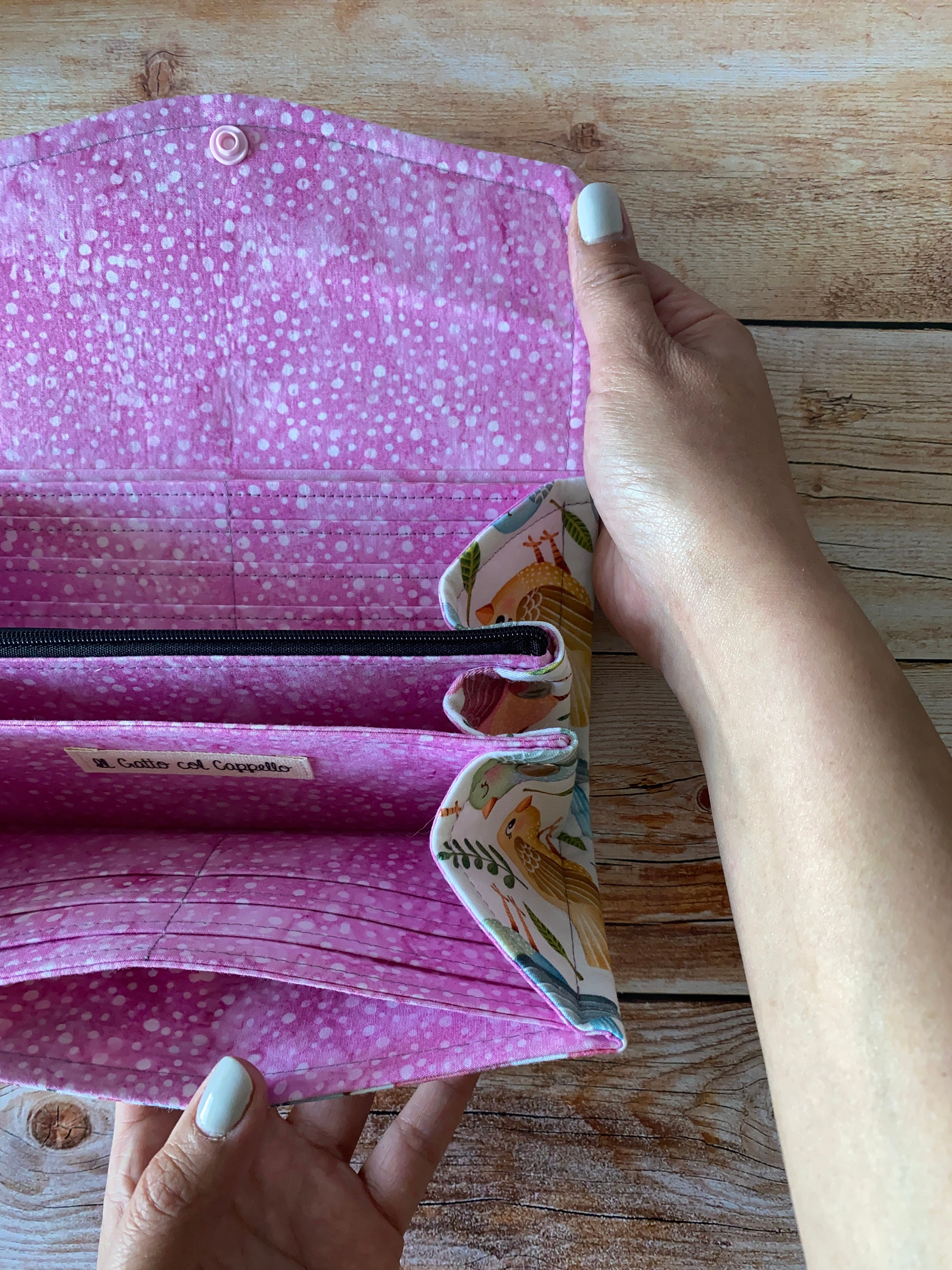 L'esterno del portafogli è realizzato in raso di cotone con stampa uccellini, l'interno in tessuto batik rosa