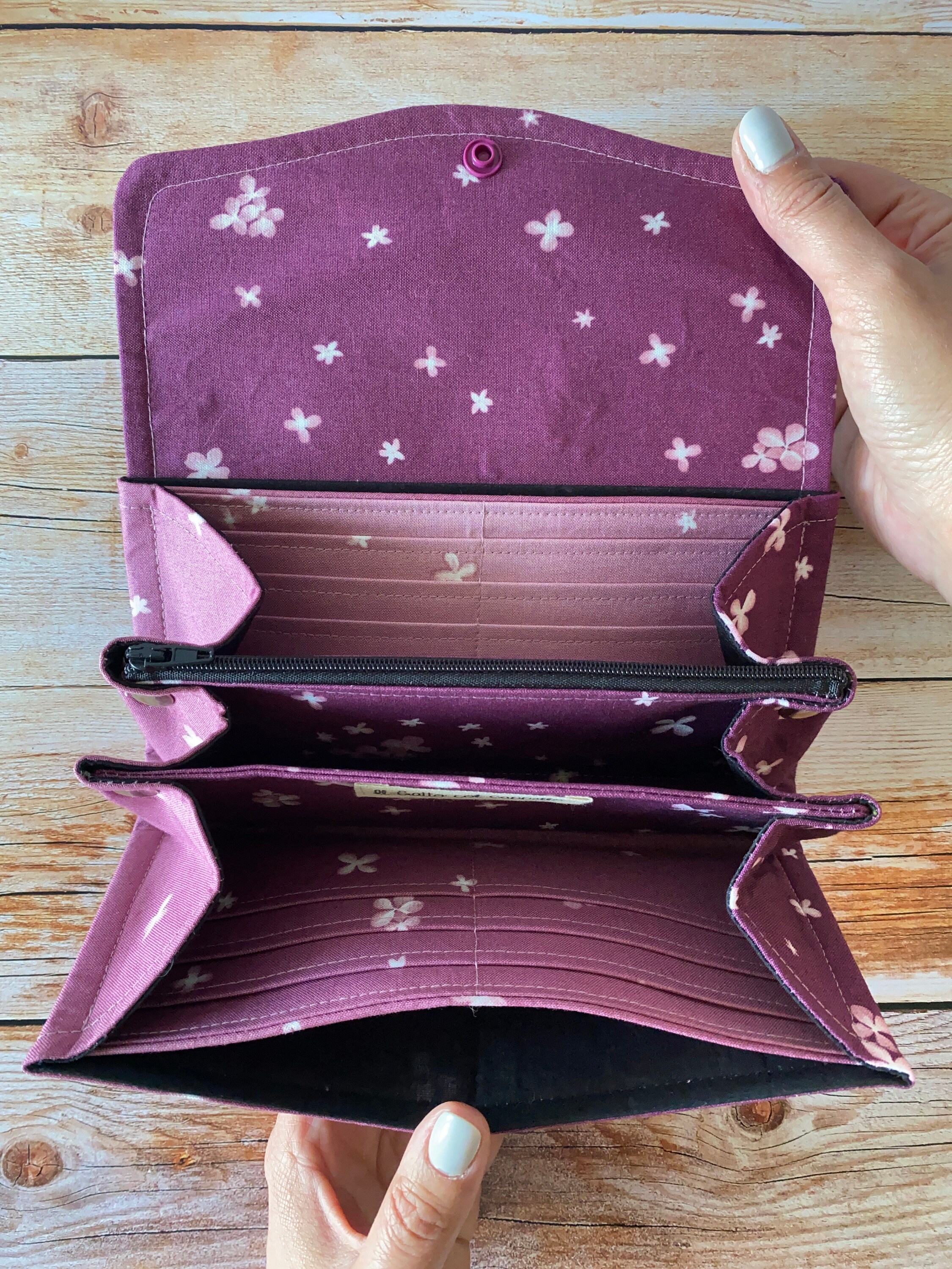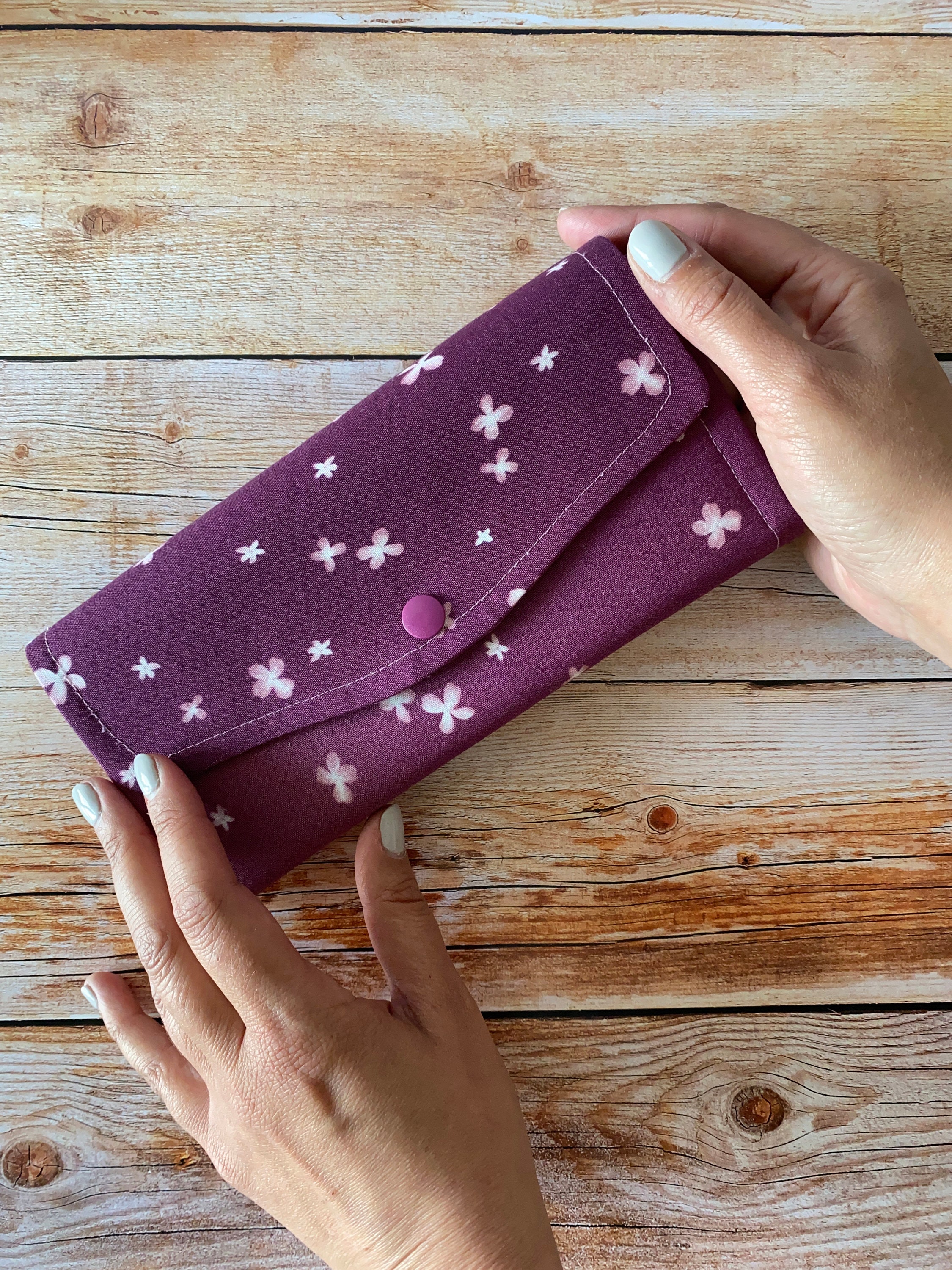 Il portafogli è interamente realizzato in tessuto di cotone stampa Sakura (fiori di ciliegio) color viola, ed è realizzato con un unico taglio di tessuto dalla caratteristica sfumatura centrale