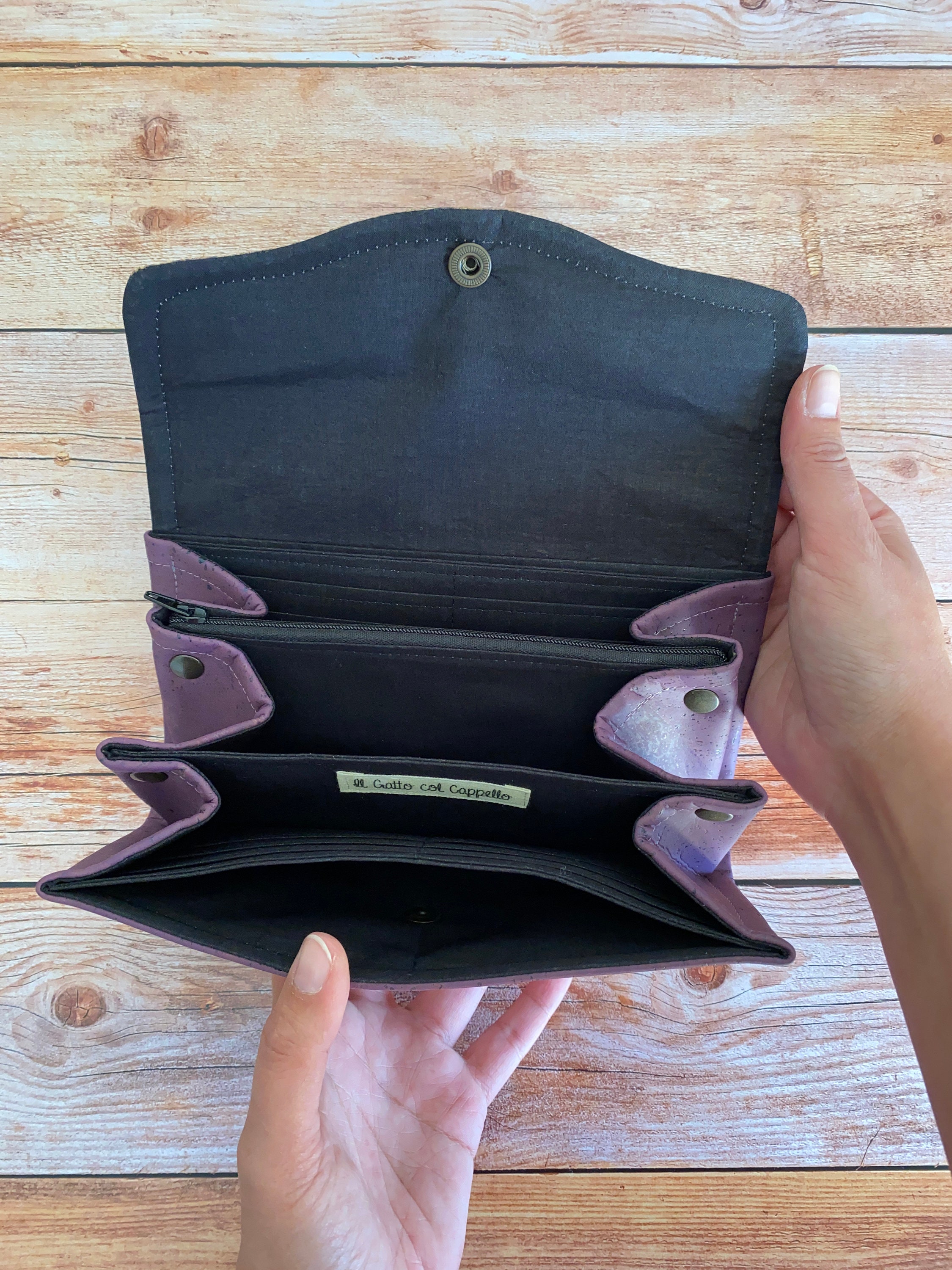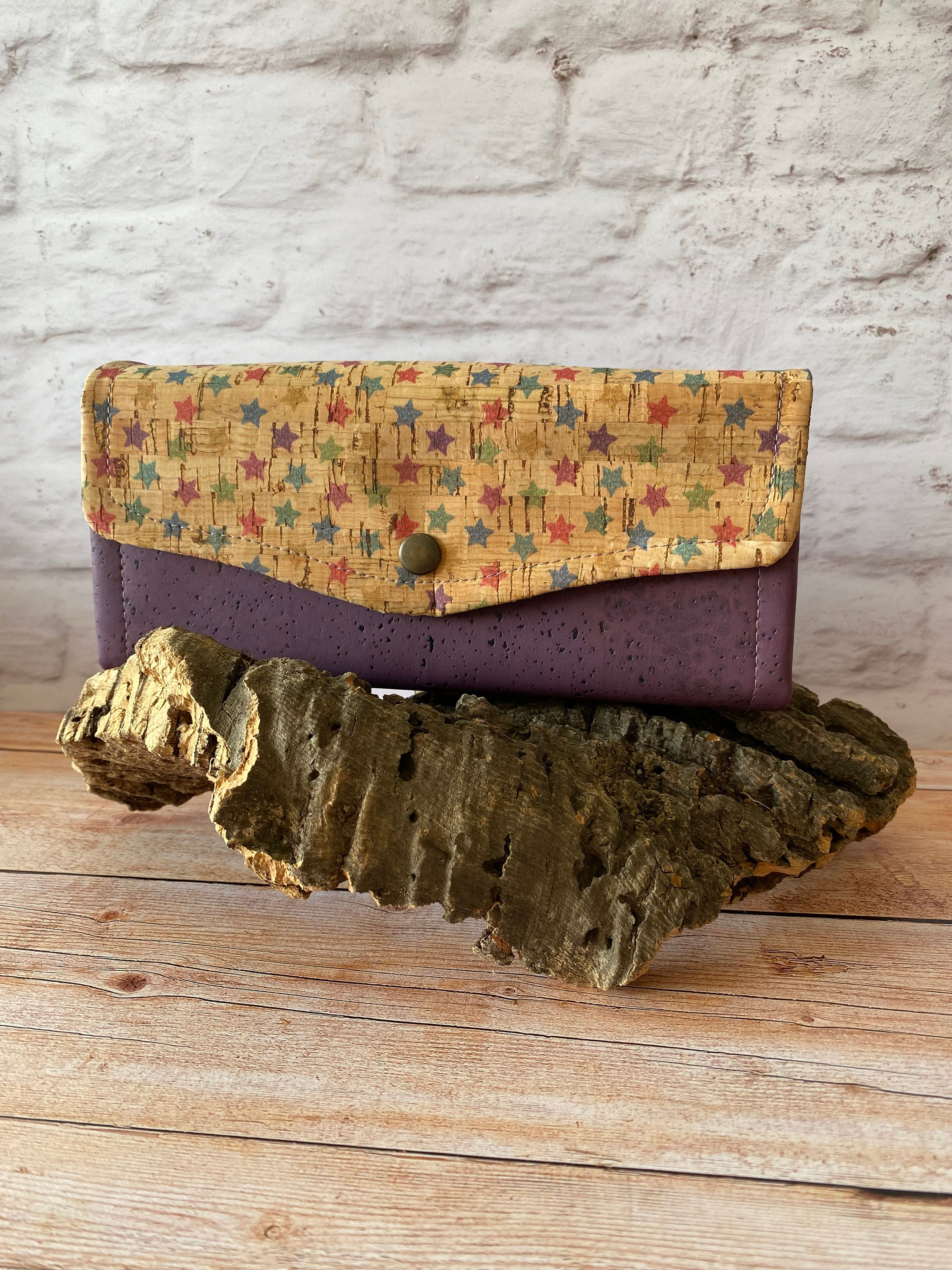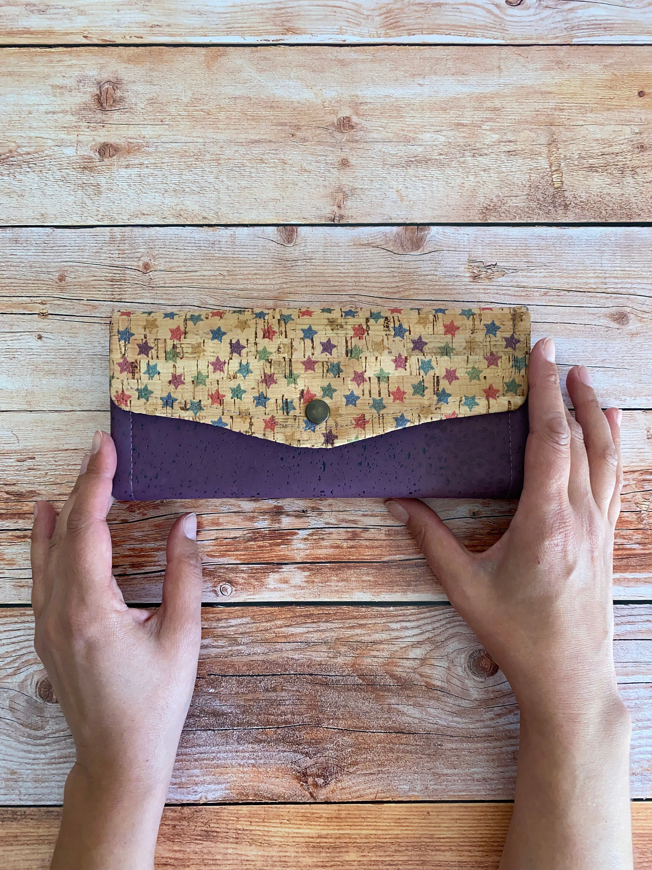 Portafogli realizzato in tessuto di sughero con stampa stelle, interno in tessuto di cotone tinta unita nero