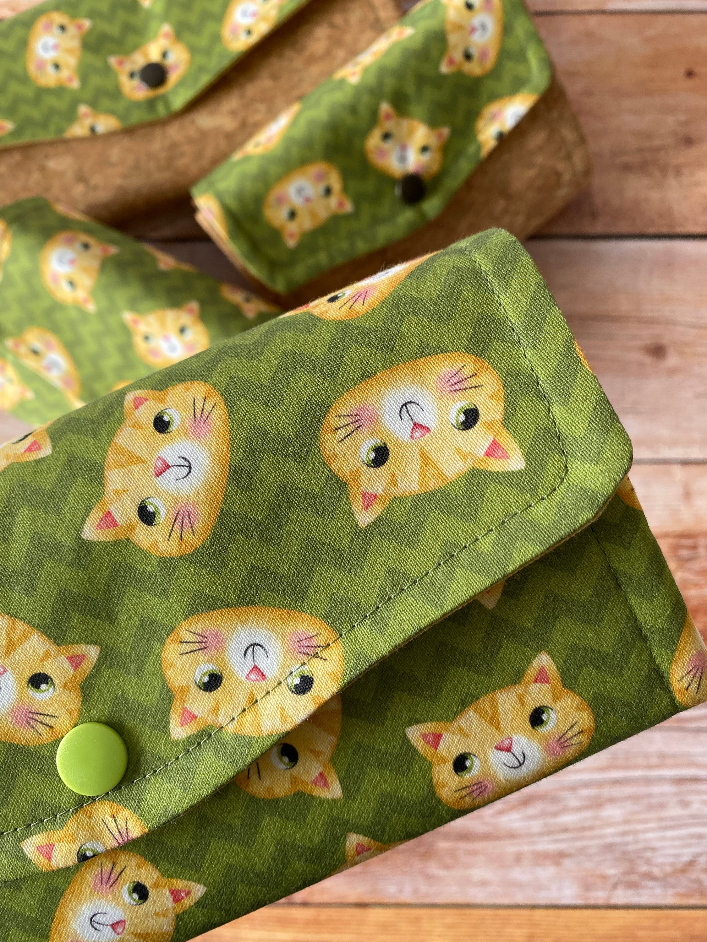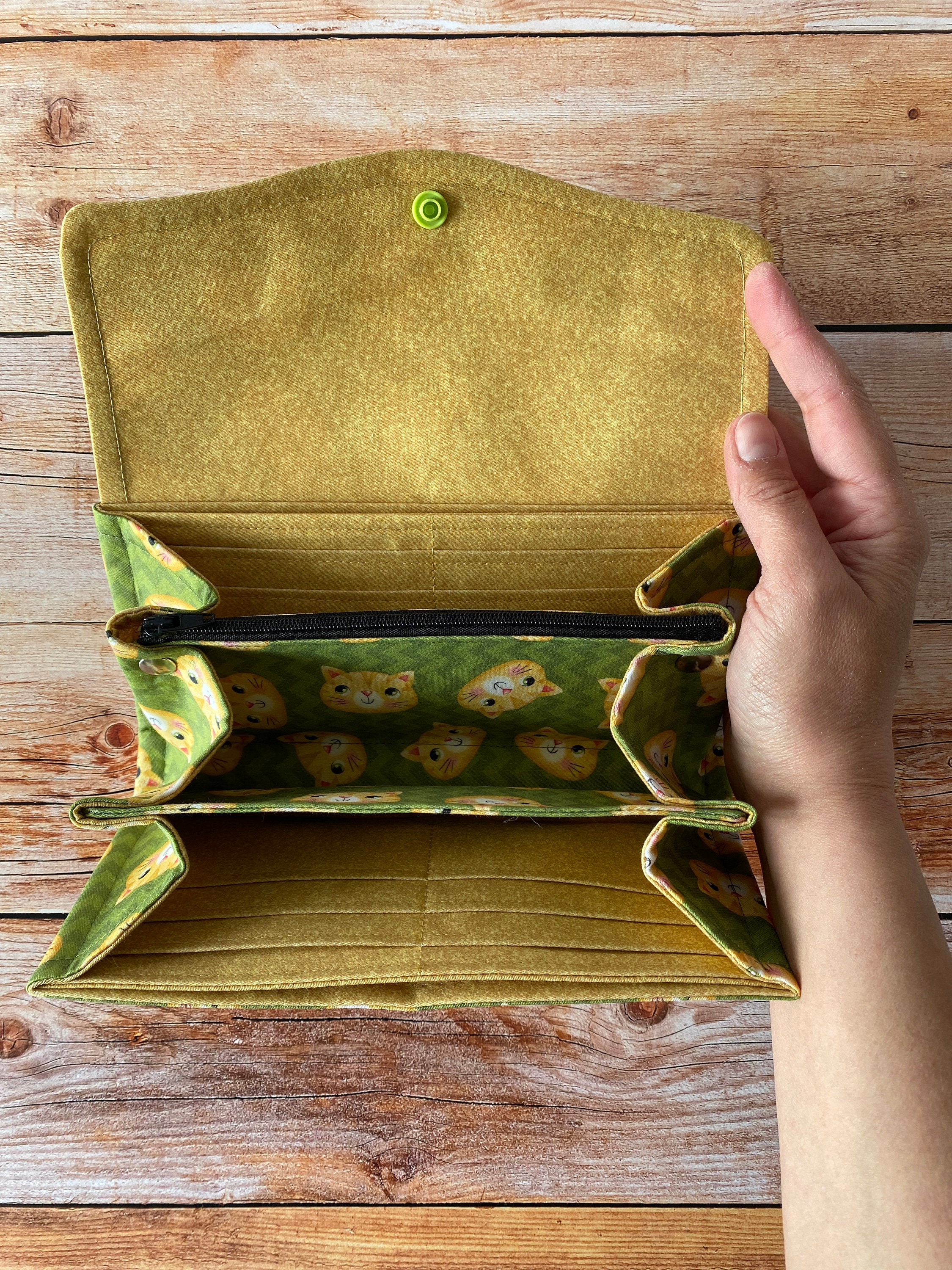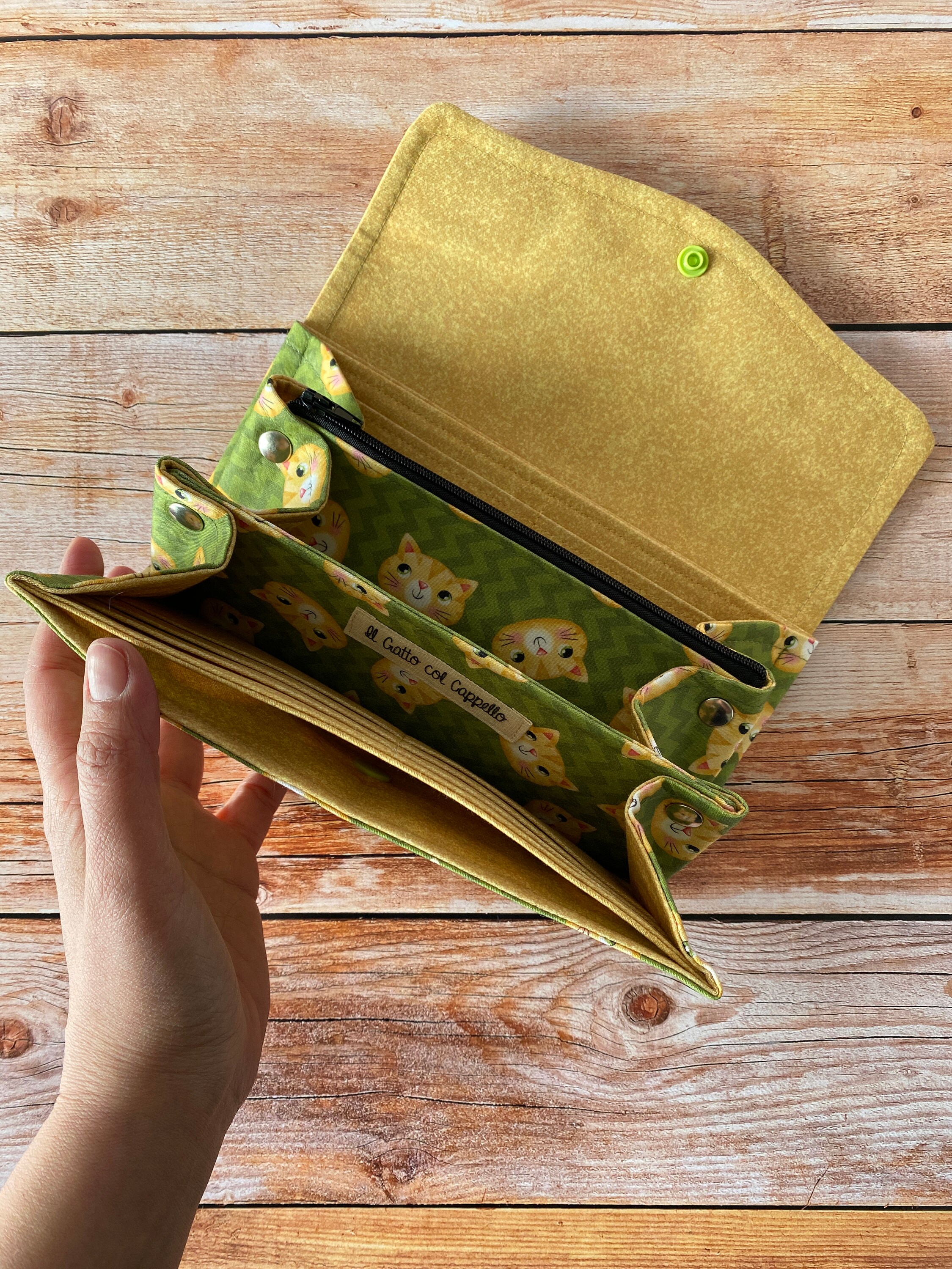 L'esterno del portafogli è realizzato in raso di cotone con stampa gatti, l'interno in tessuto di cotone giallo
