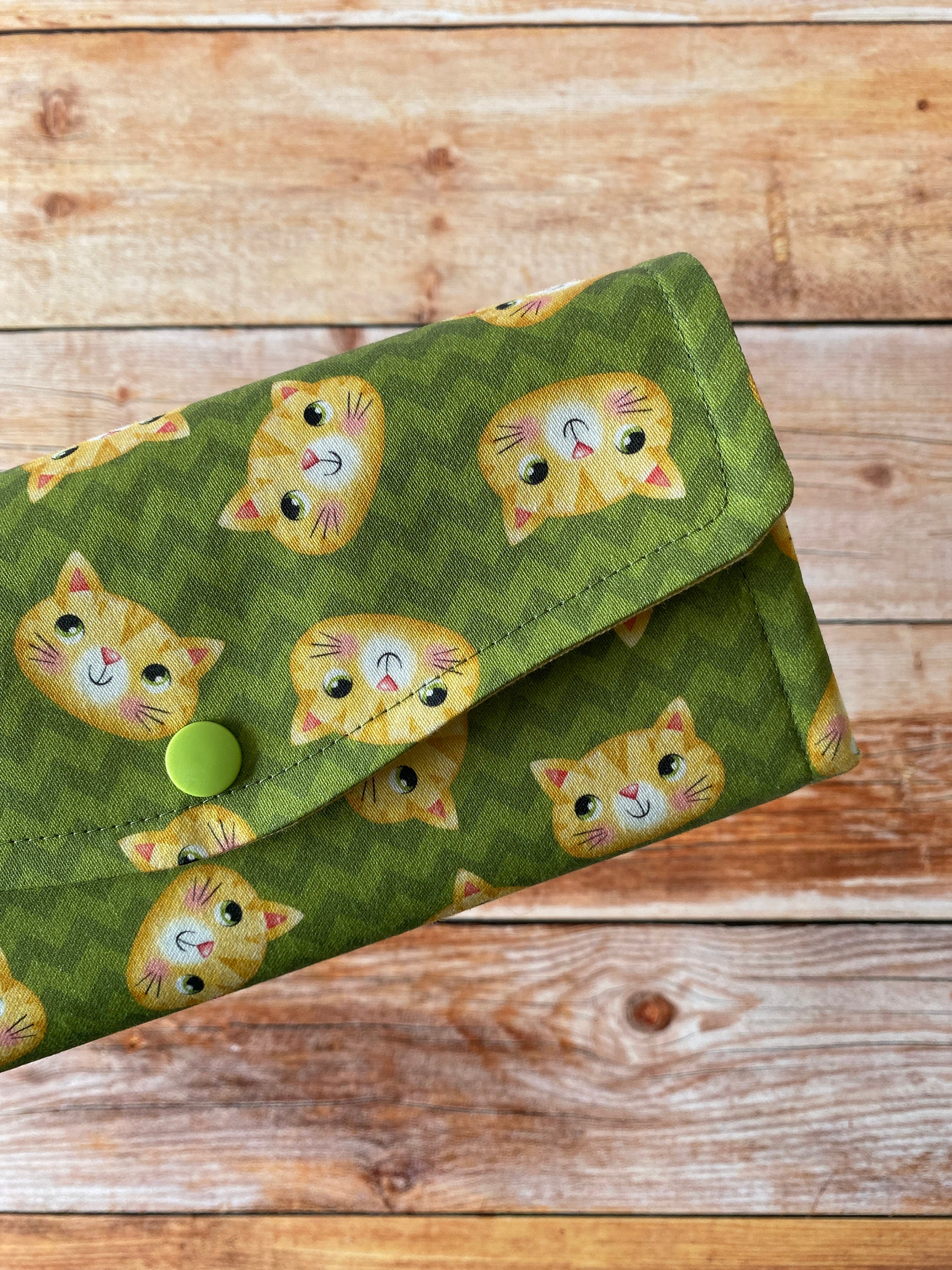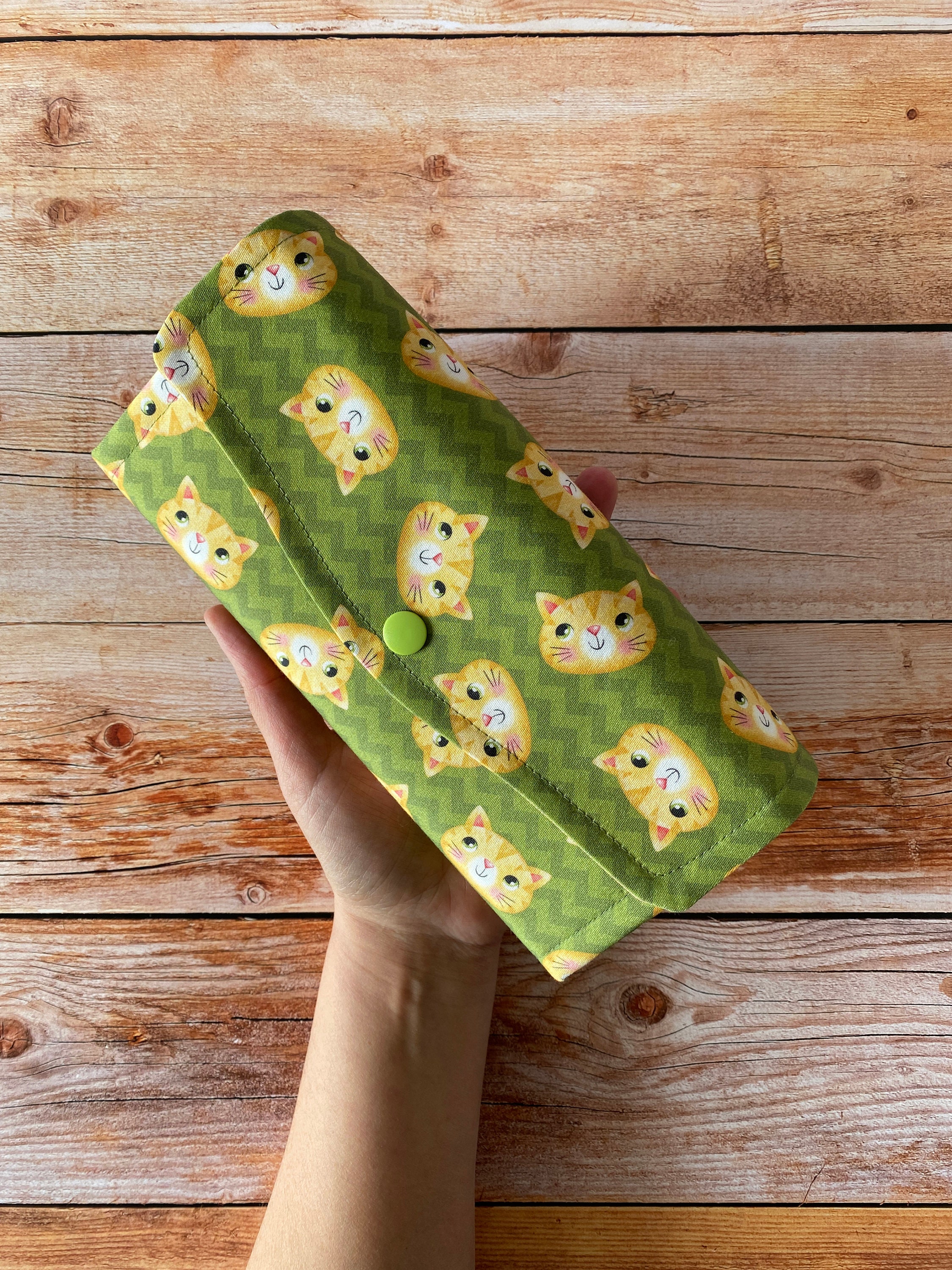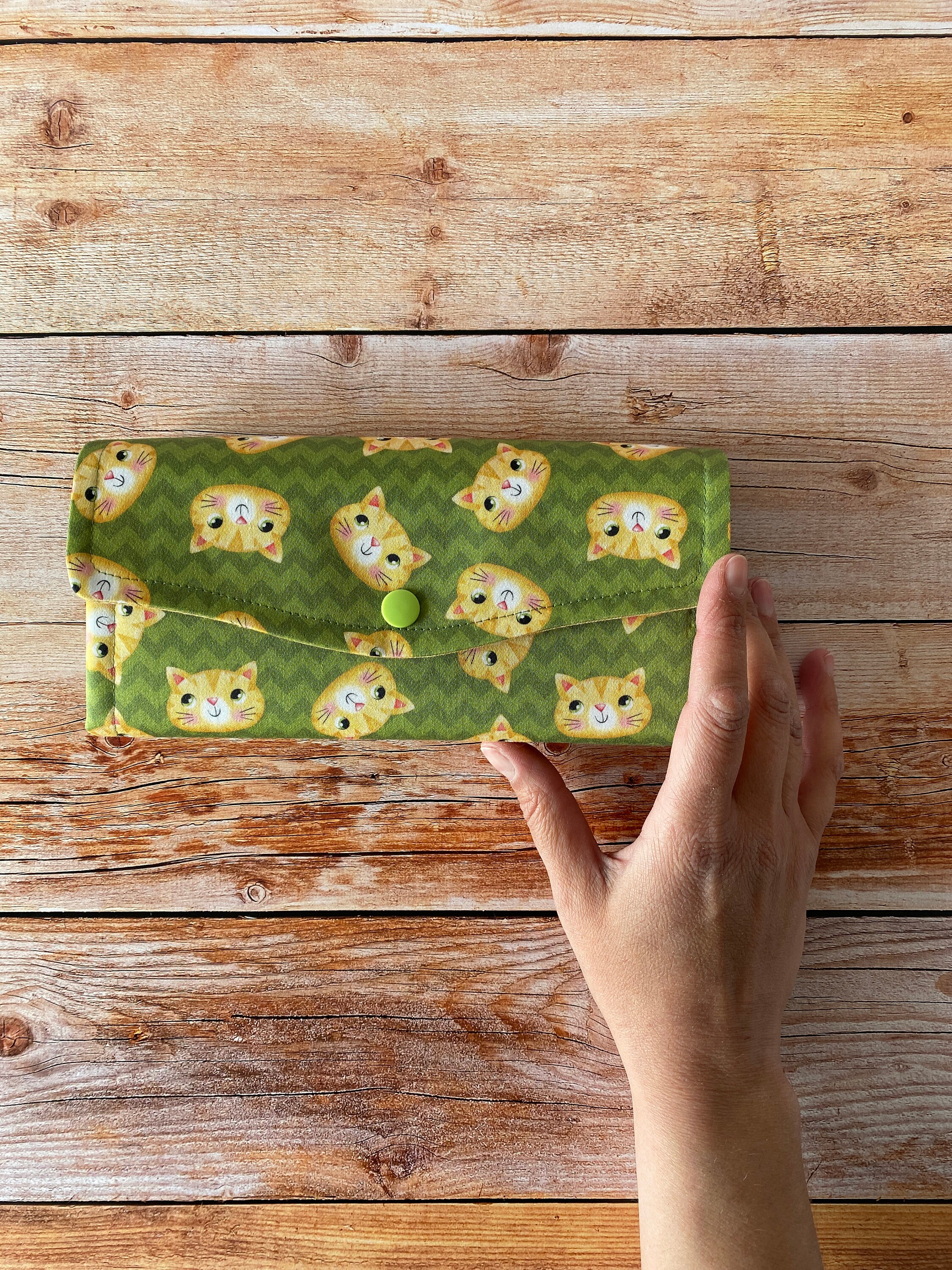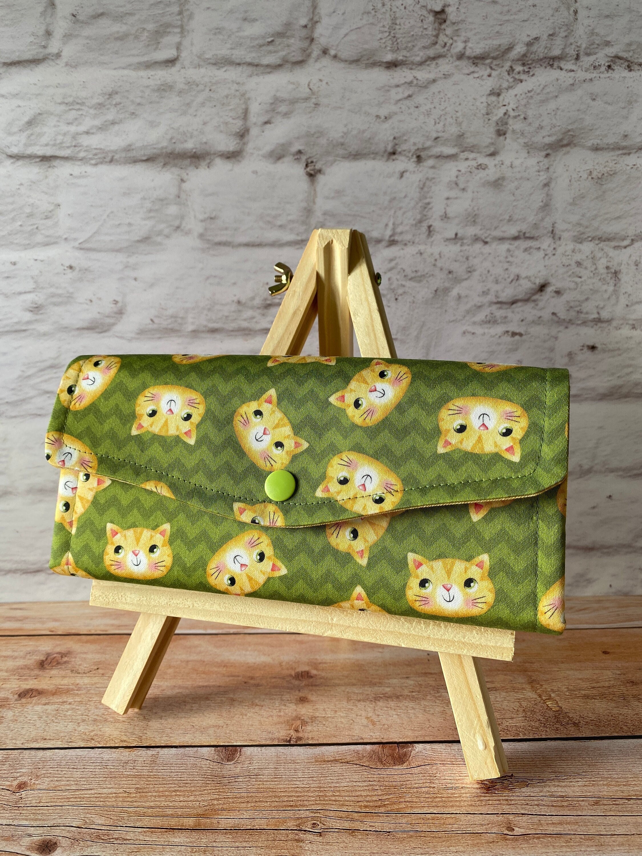 L'esterno del portafogli è realizzato in raso di cotone con stampa gatti, l'interno in tessuto di cotone giallo