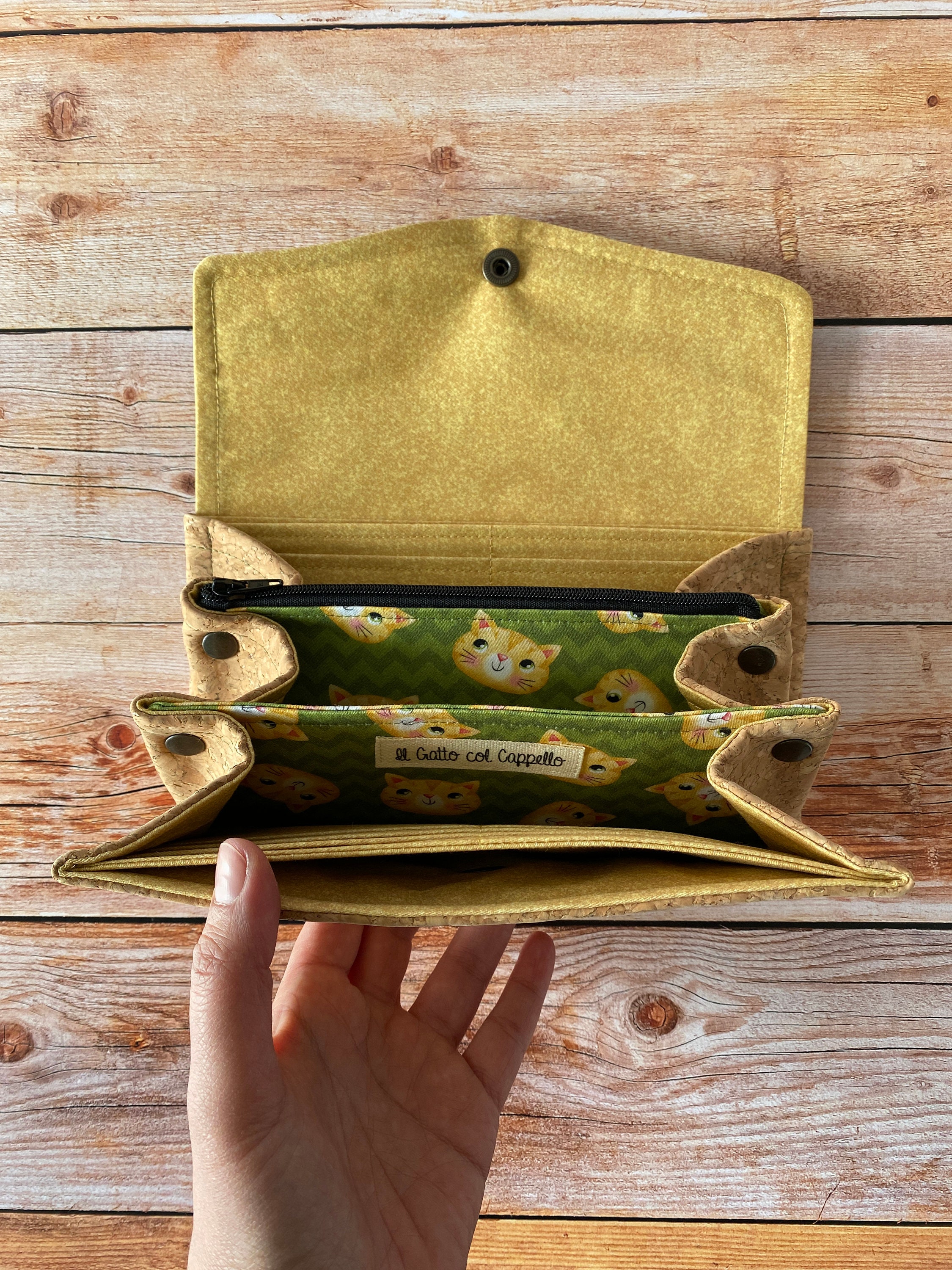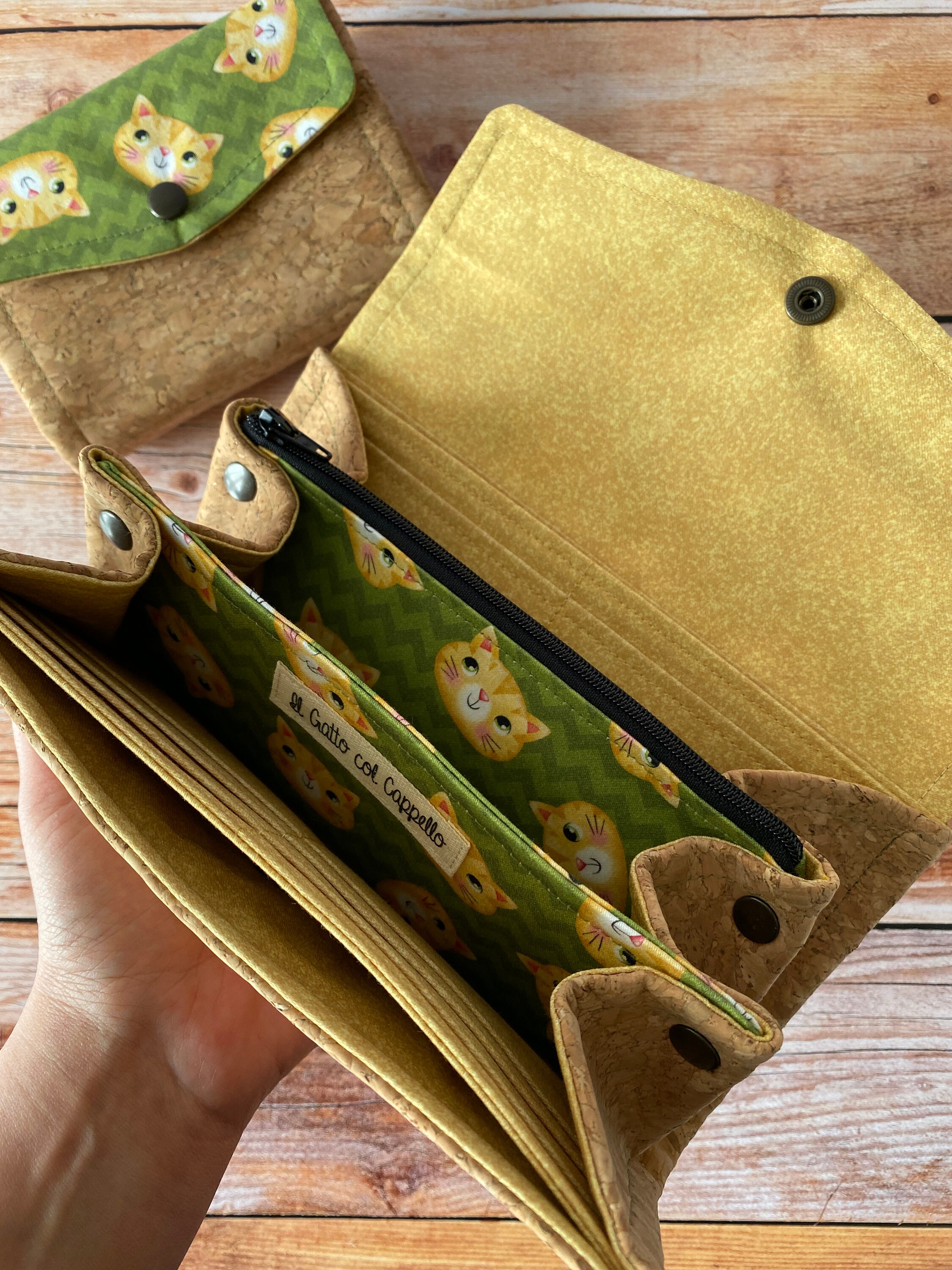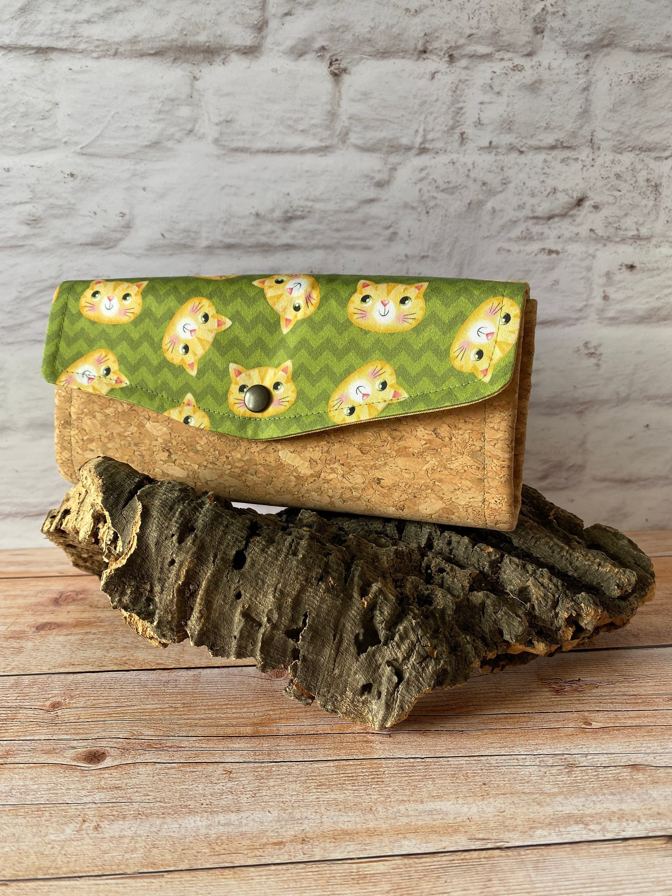 Portafogli grande in sughero e raso di cotone, stampa gatti