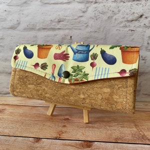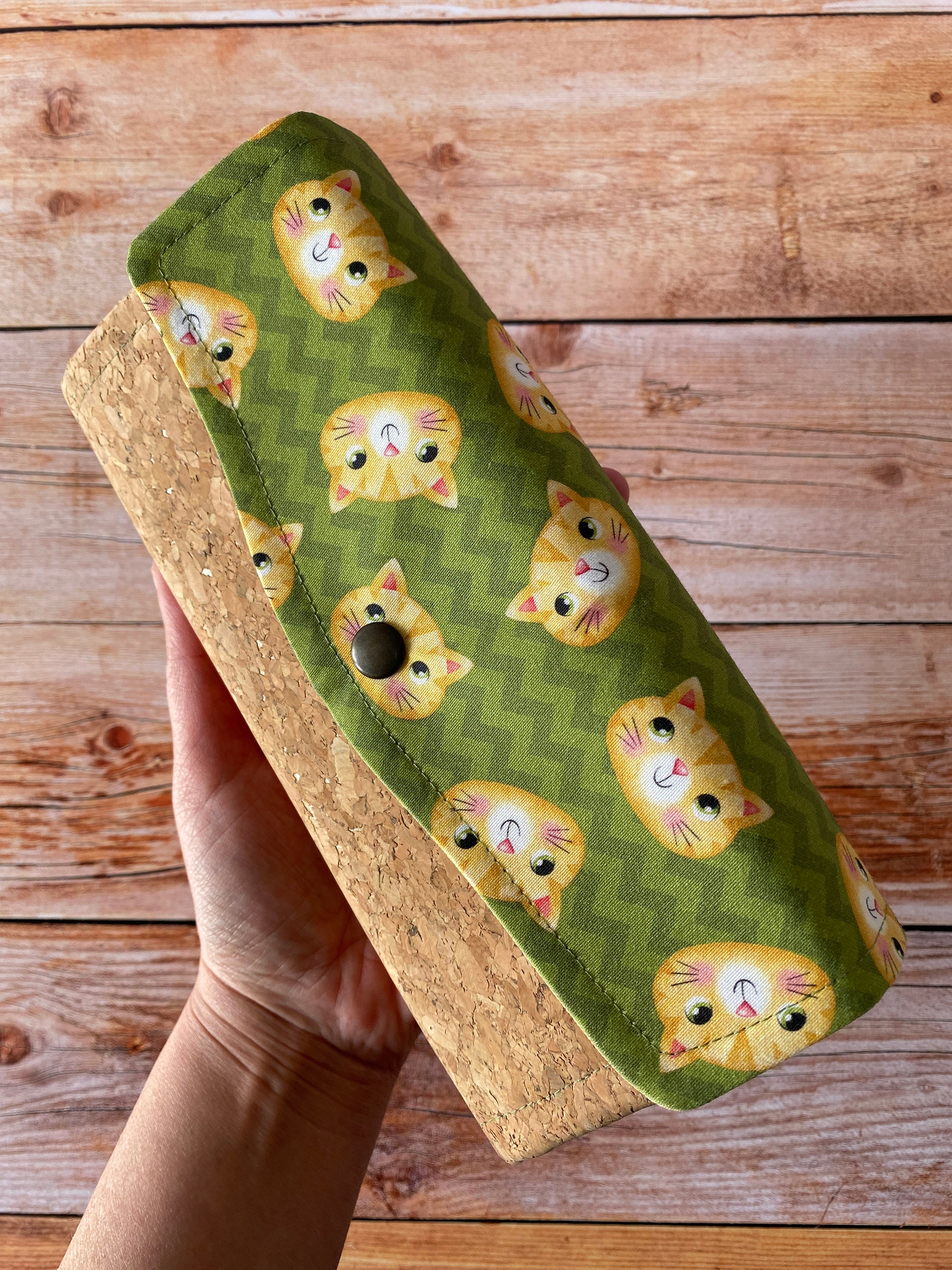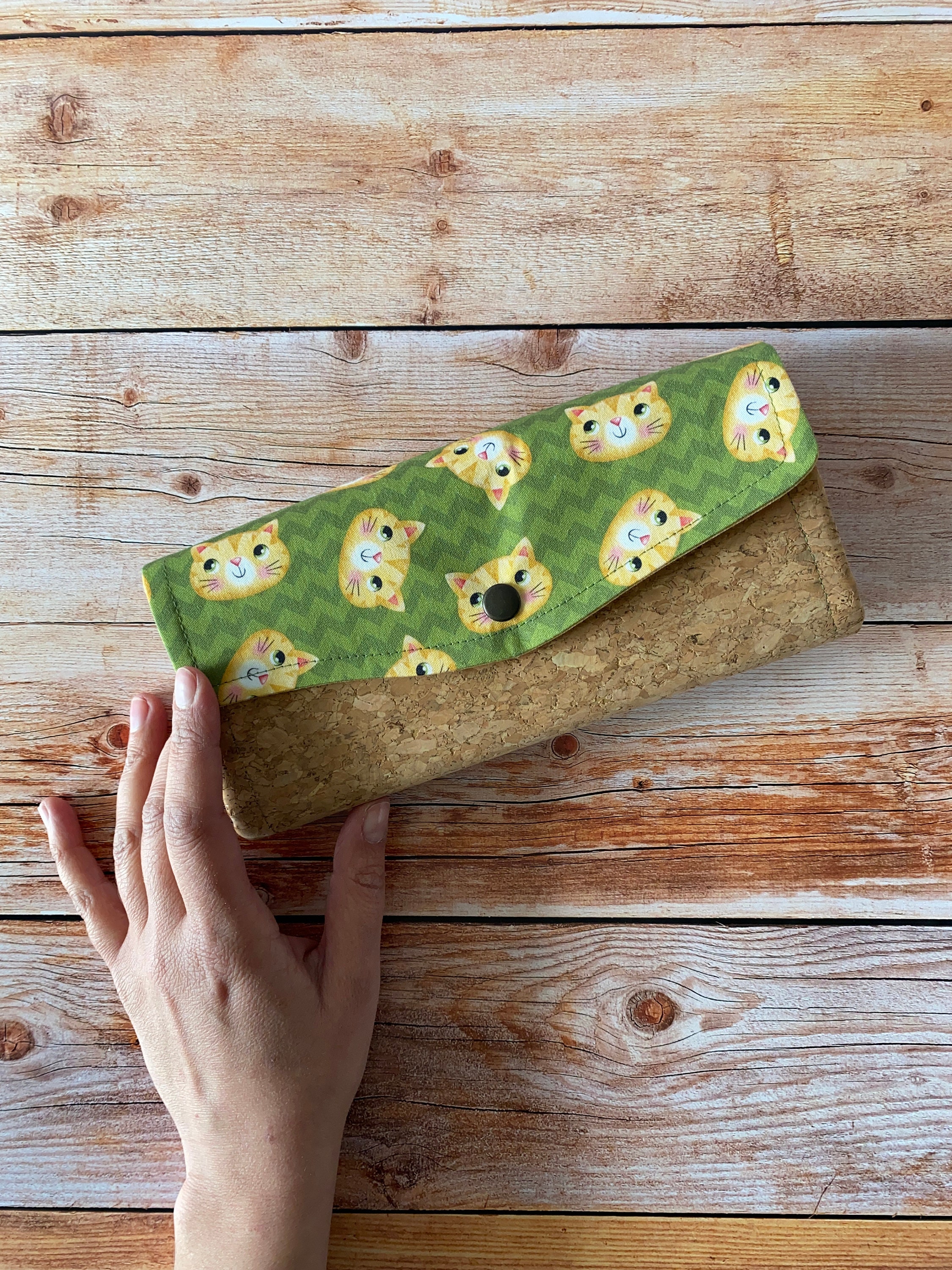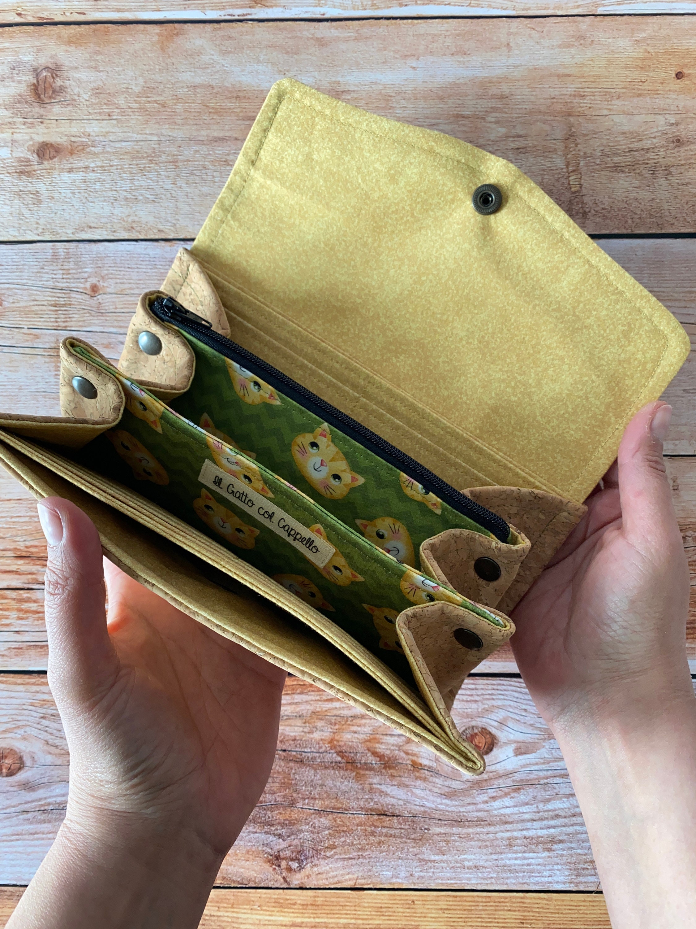 Portafogli grande in sughero e raso di cotone, stampa gatti