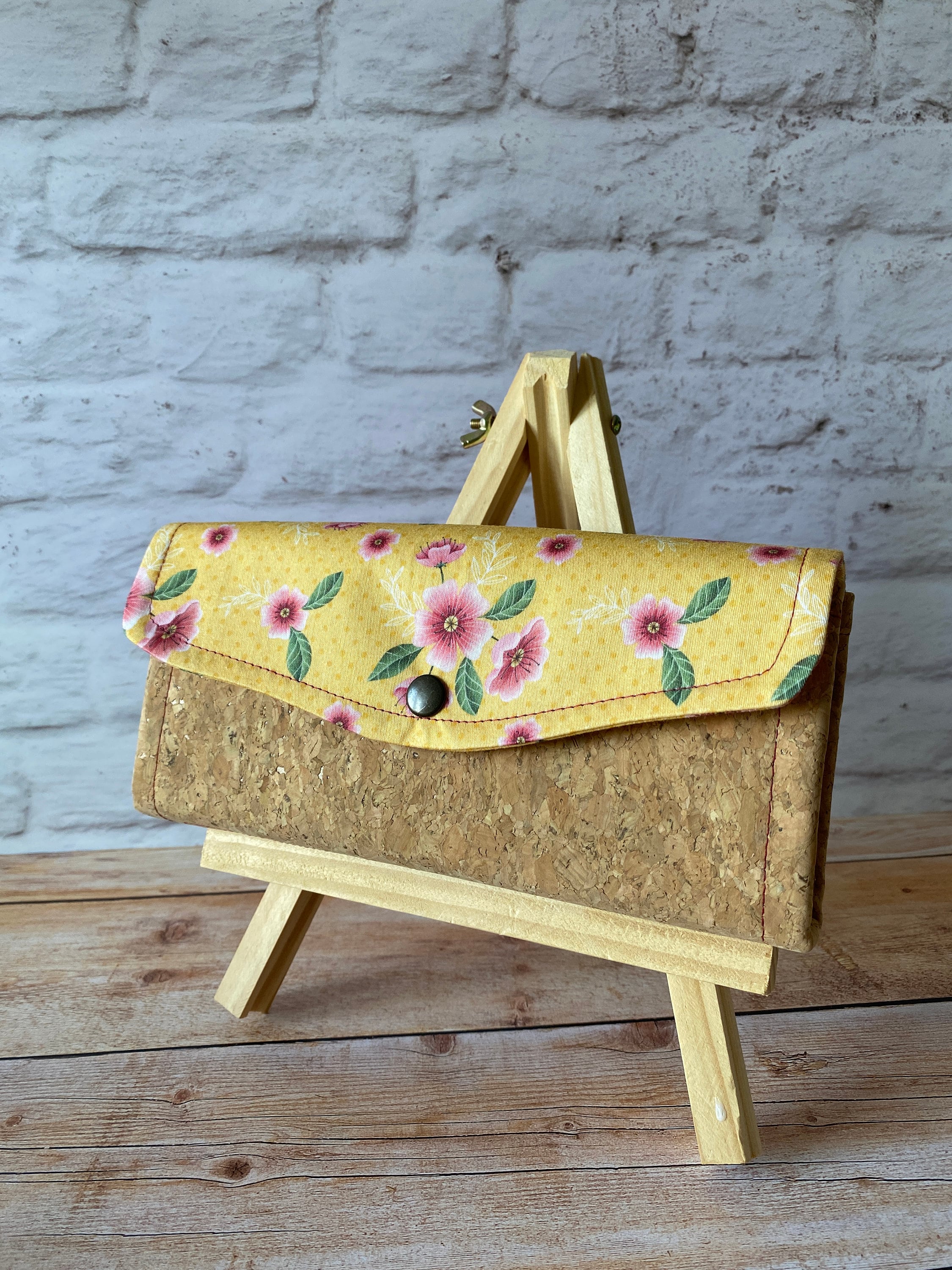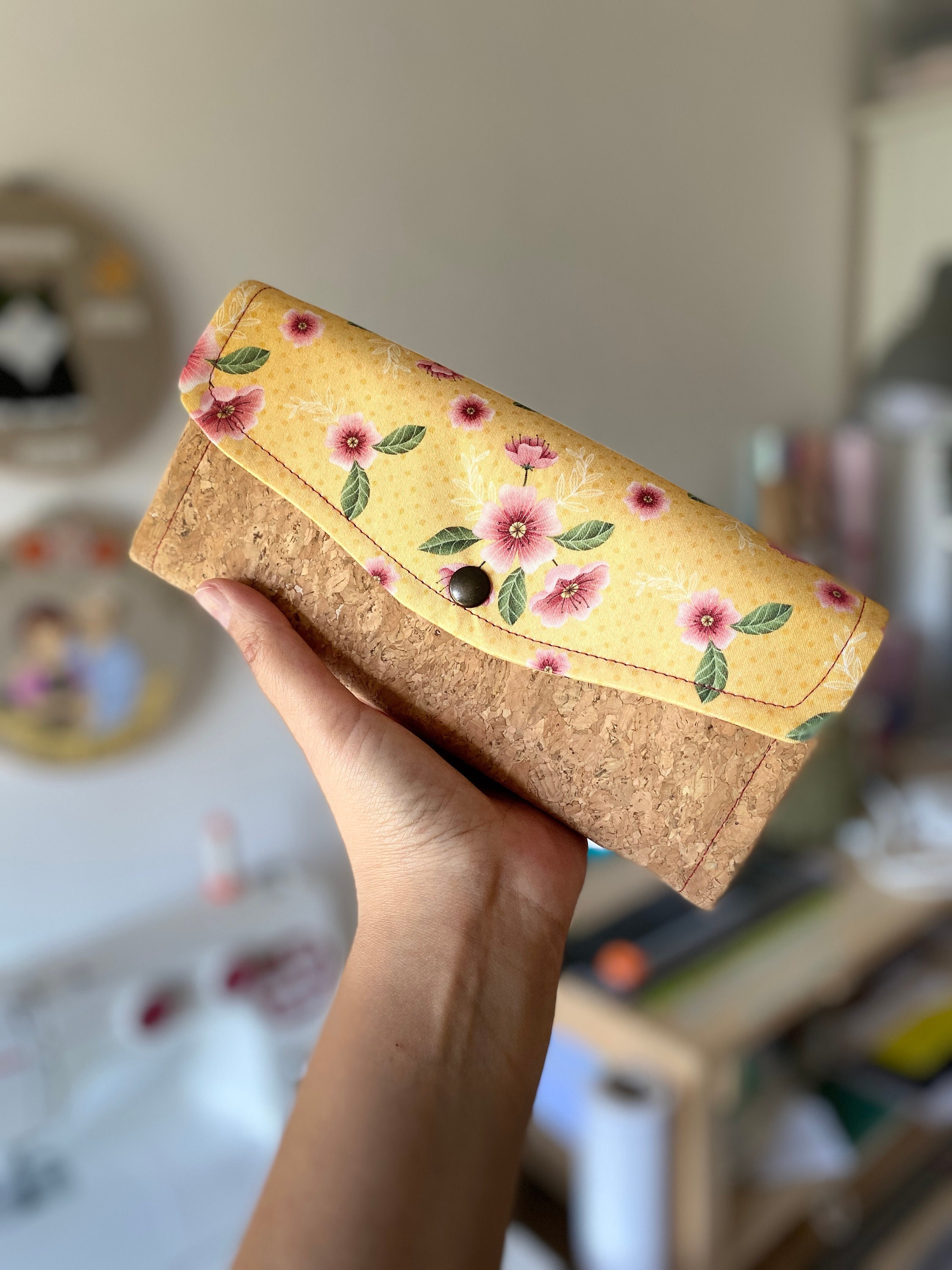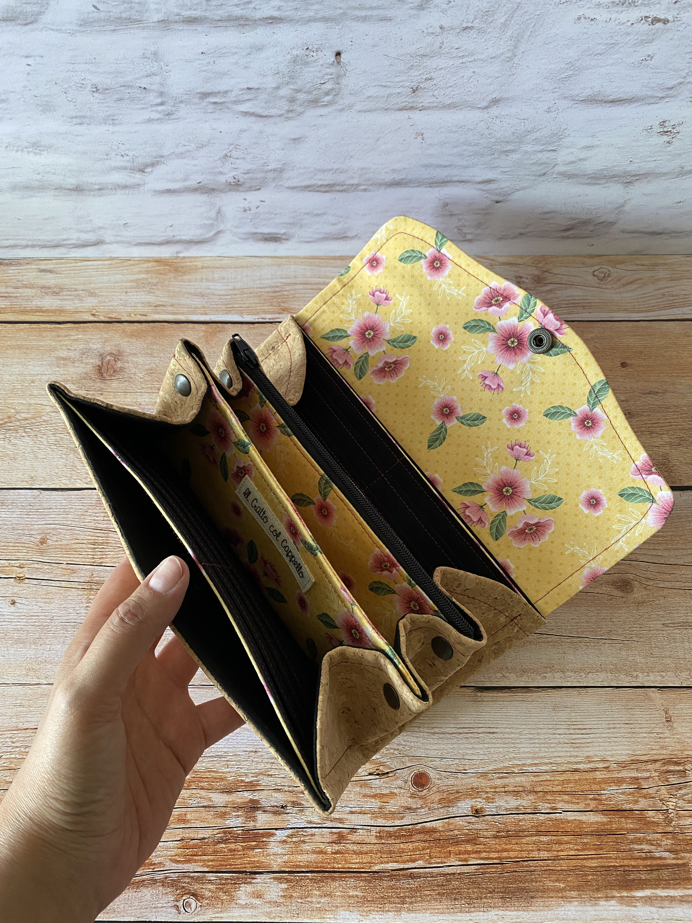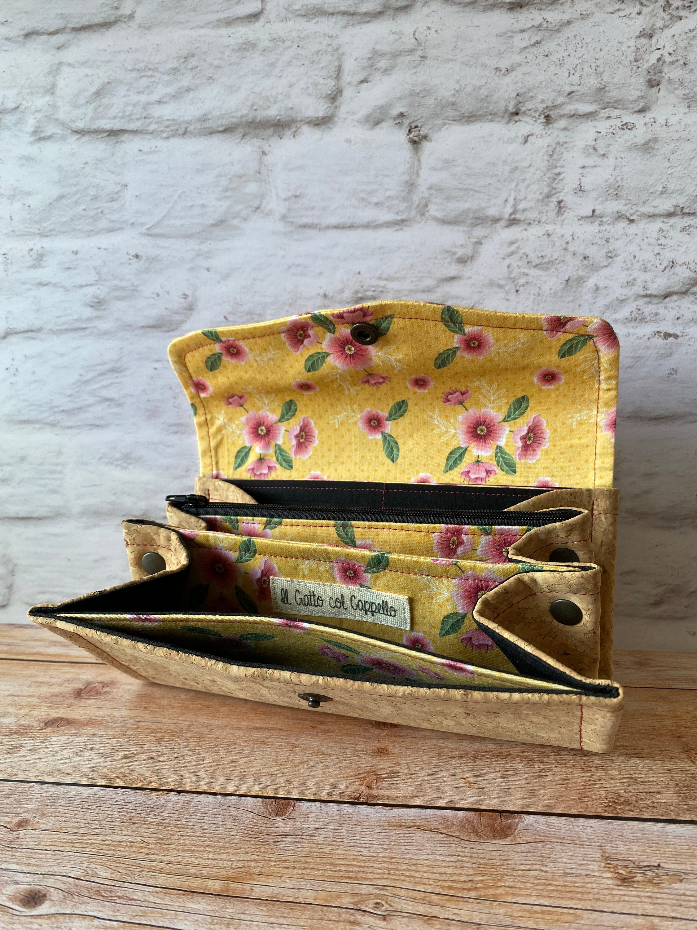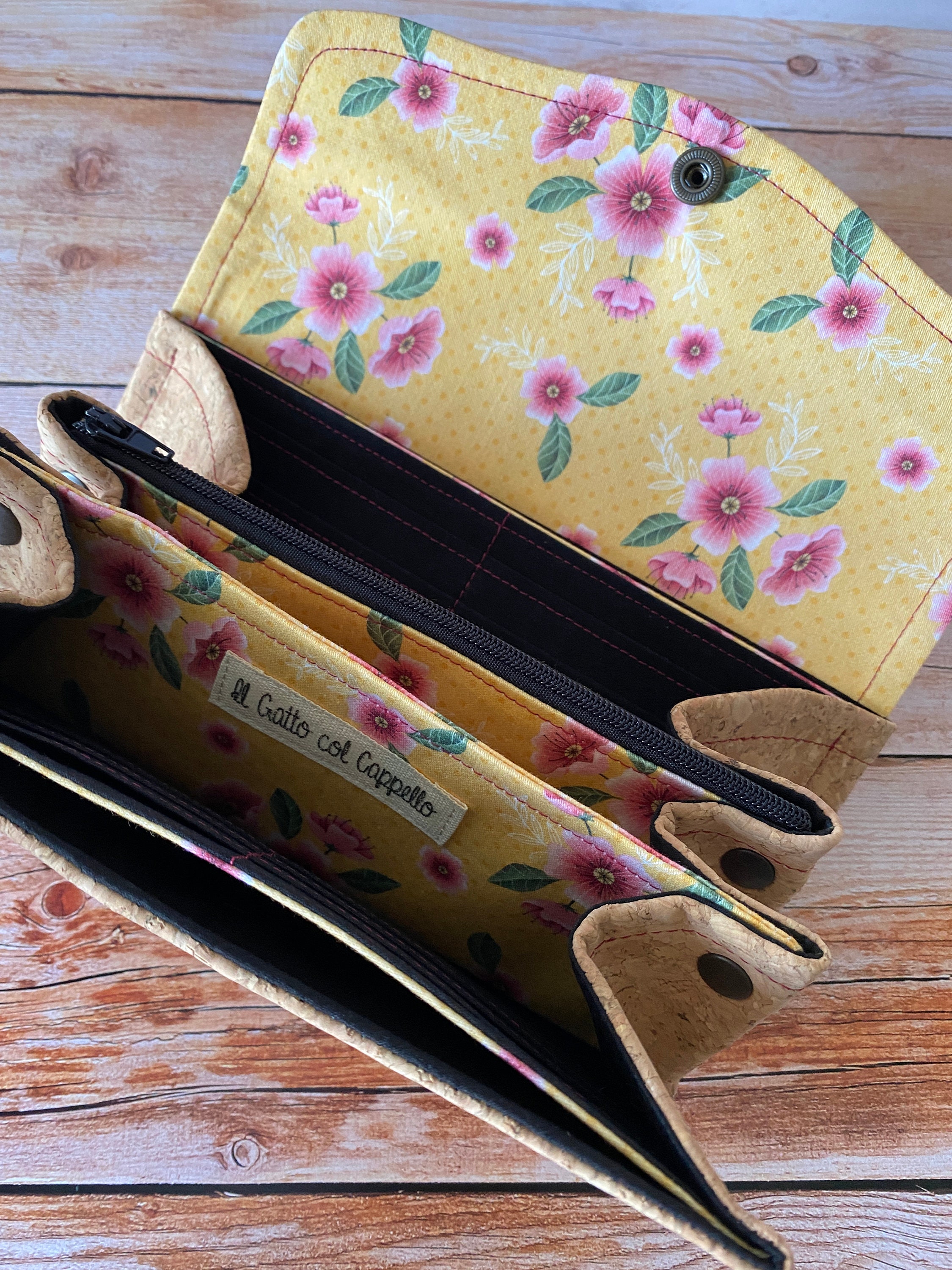 L'esterno del portafogli è realizzato in tessuto di sughero e raso di cotone, l'interno in tessuto di cotone