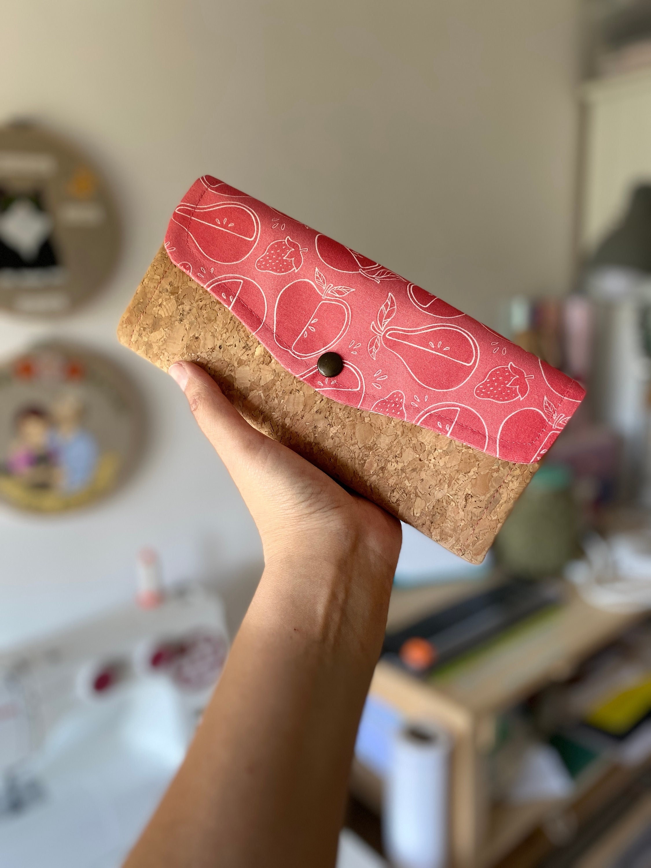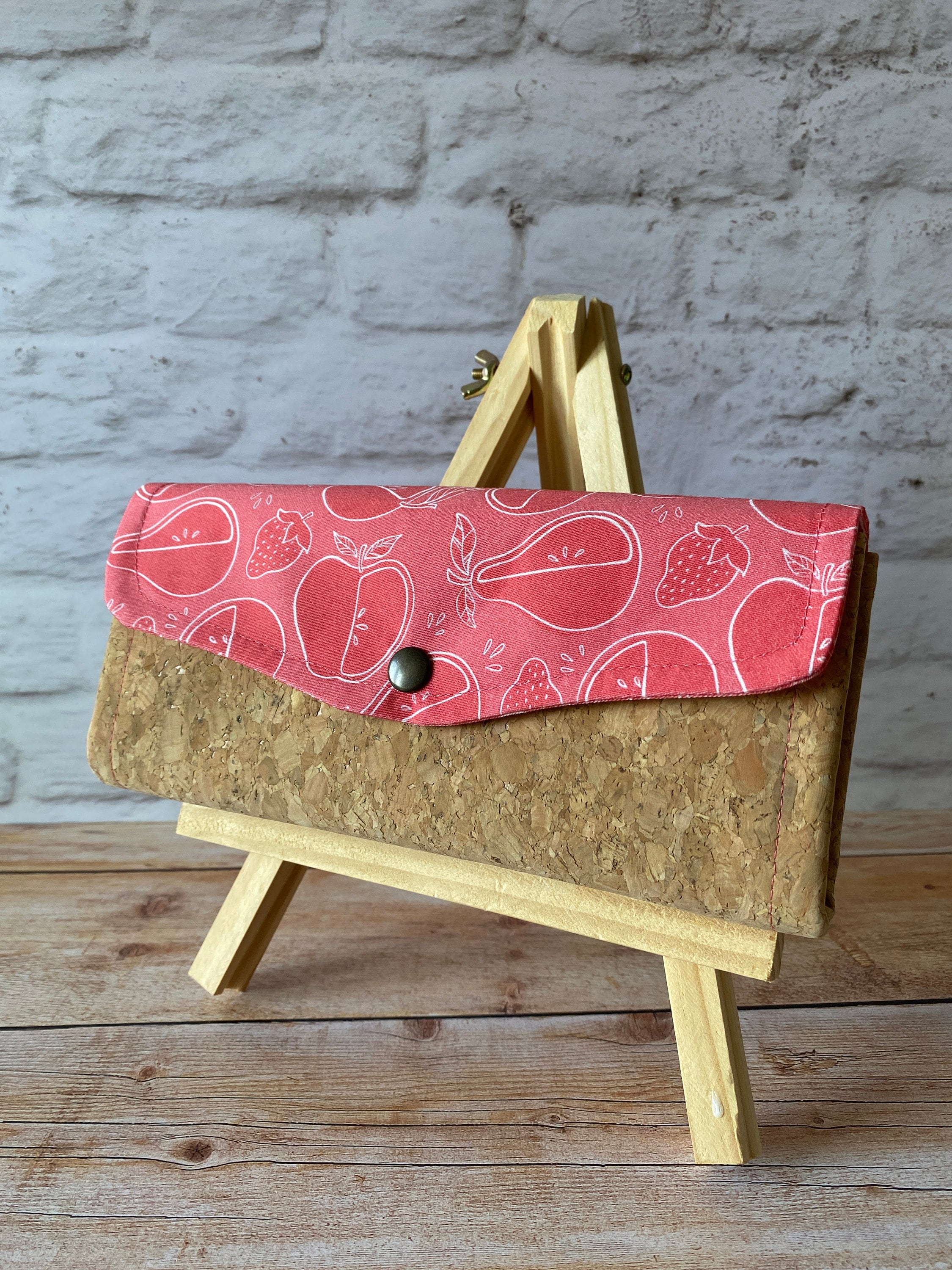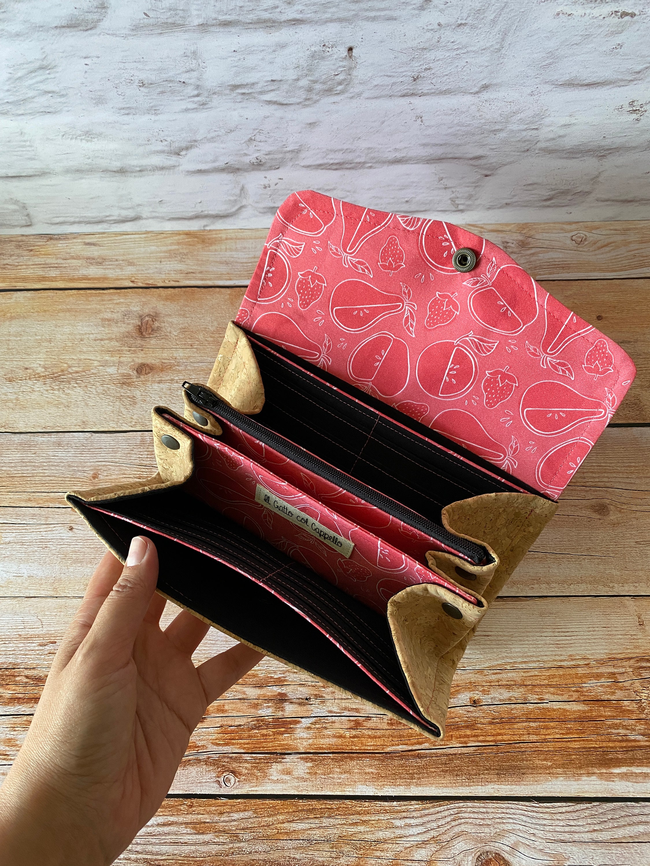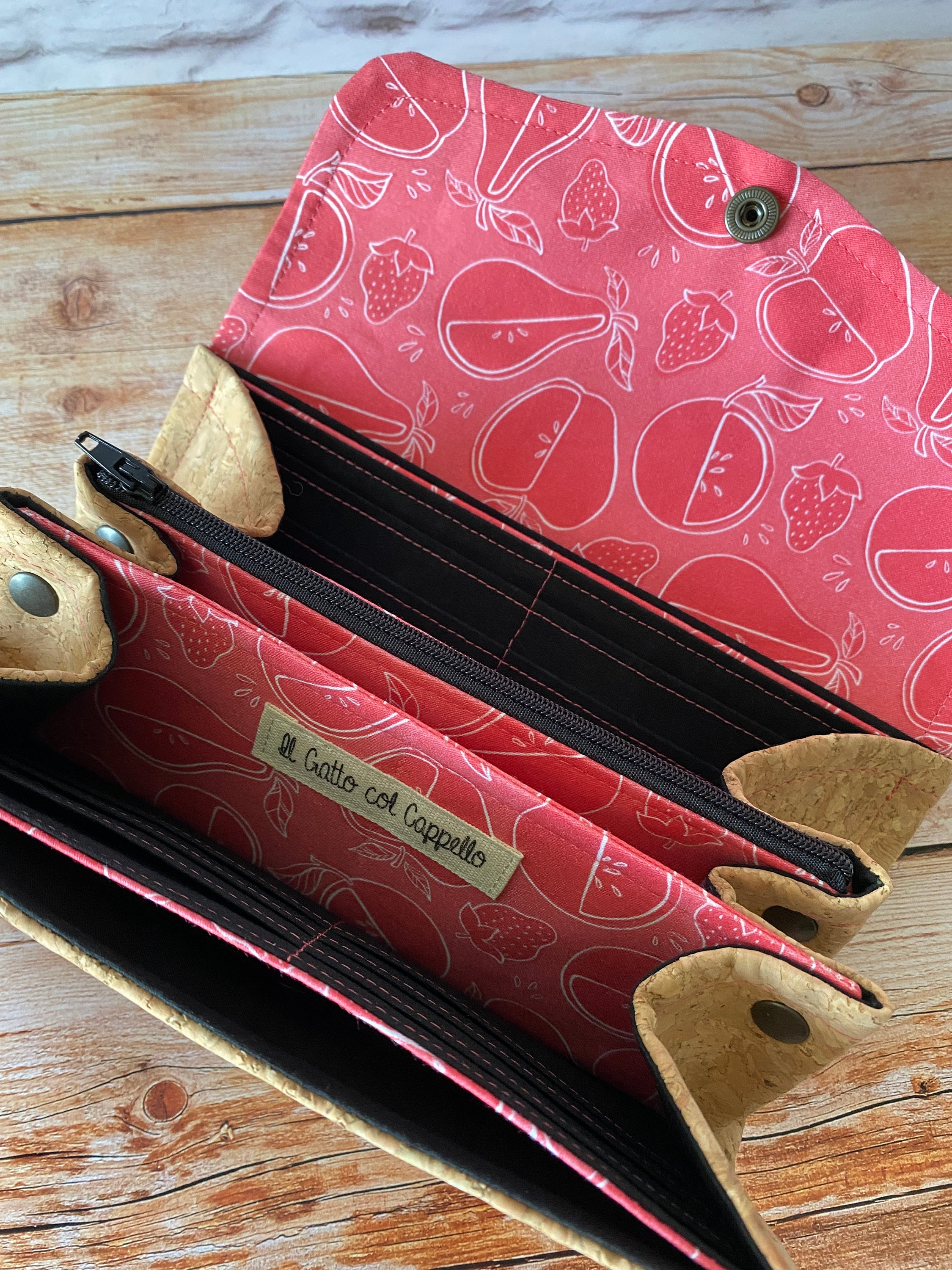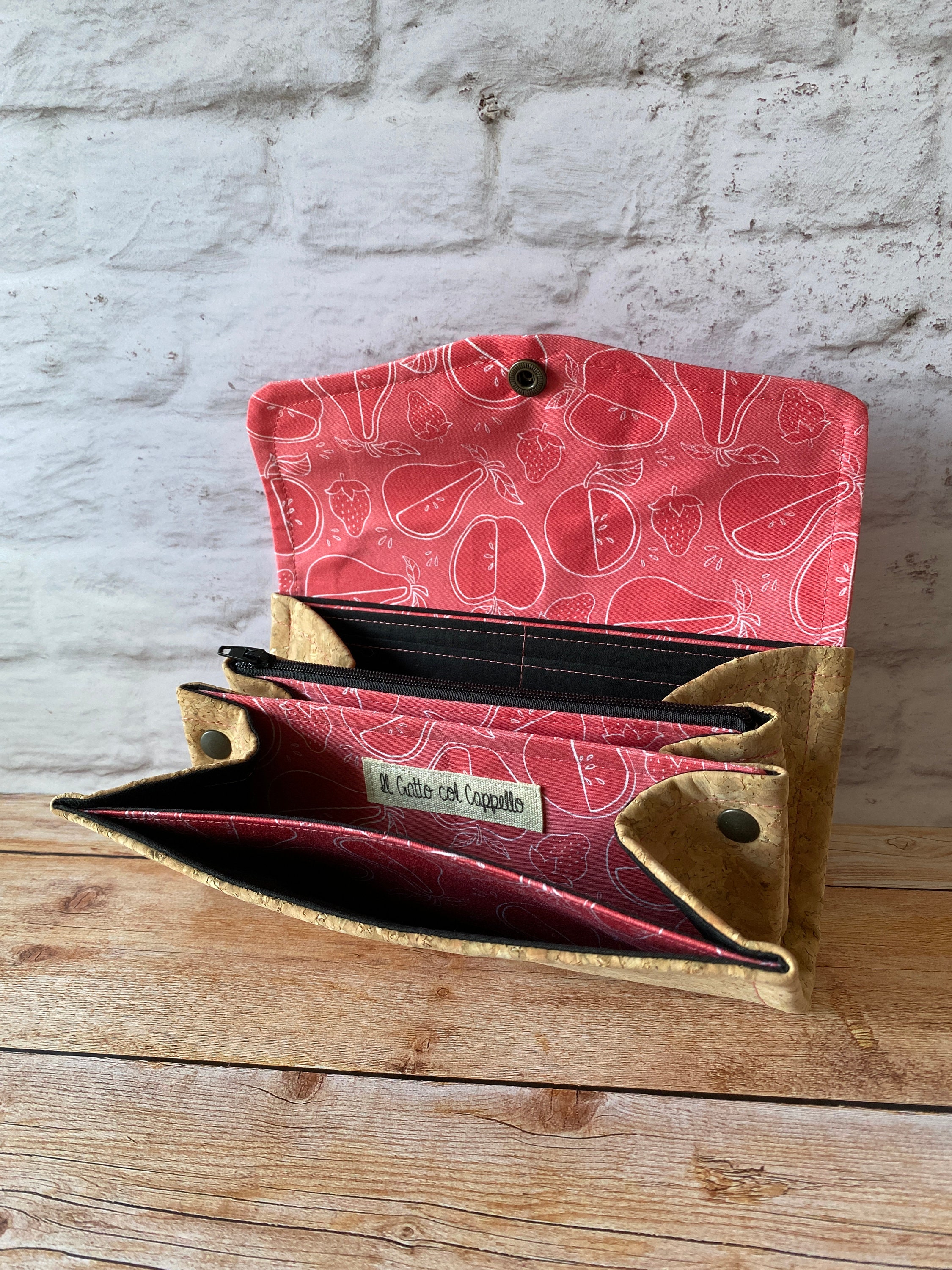 L'esterno del portafogli è realizzato in tessuto di sughero e raso di cotone, l'interno in tessuto di cotone
