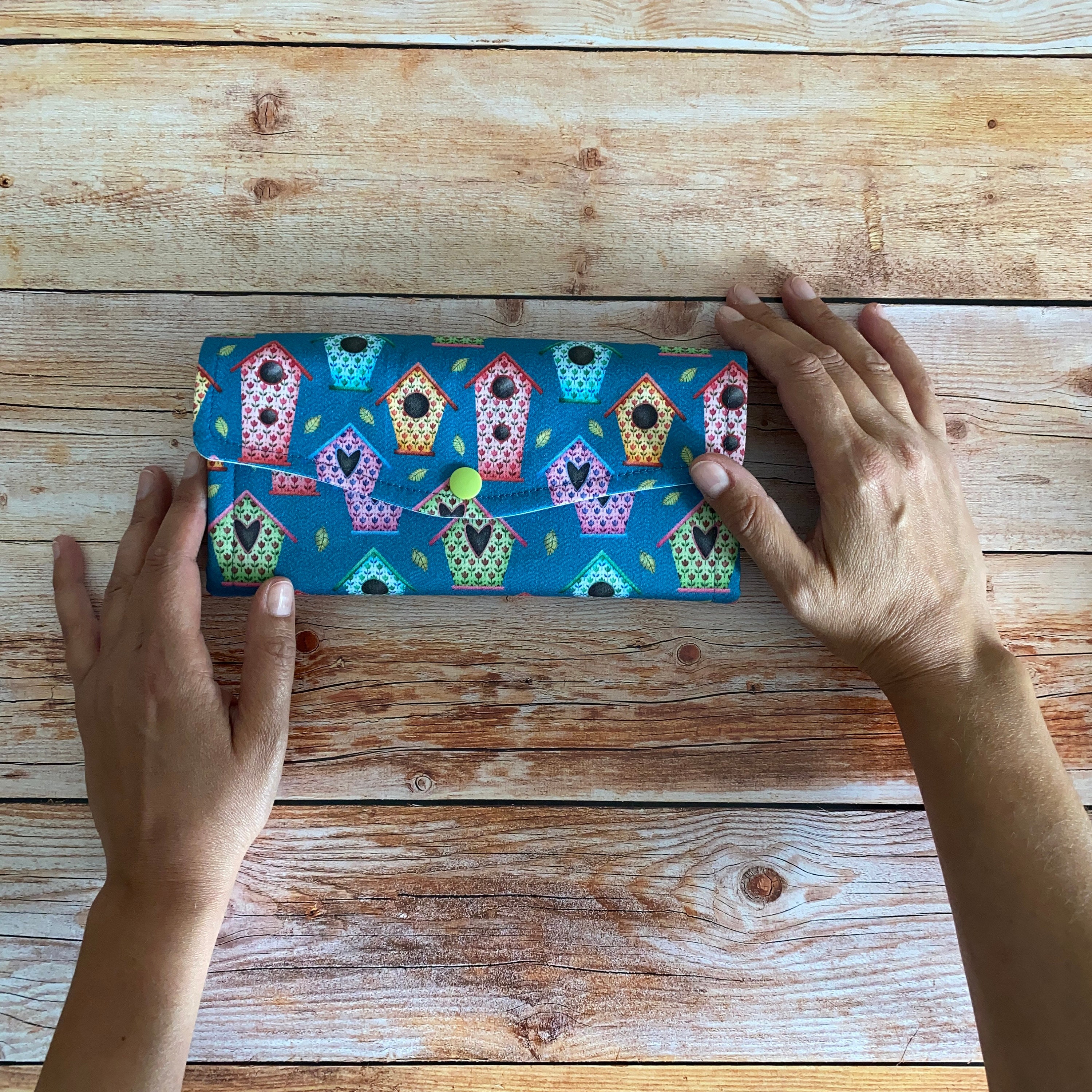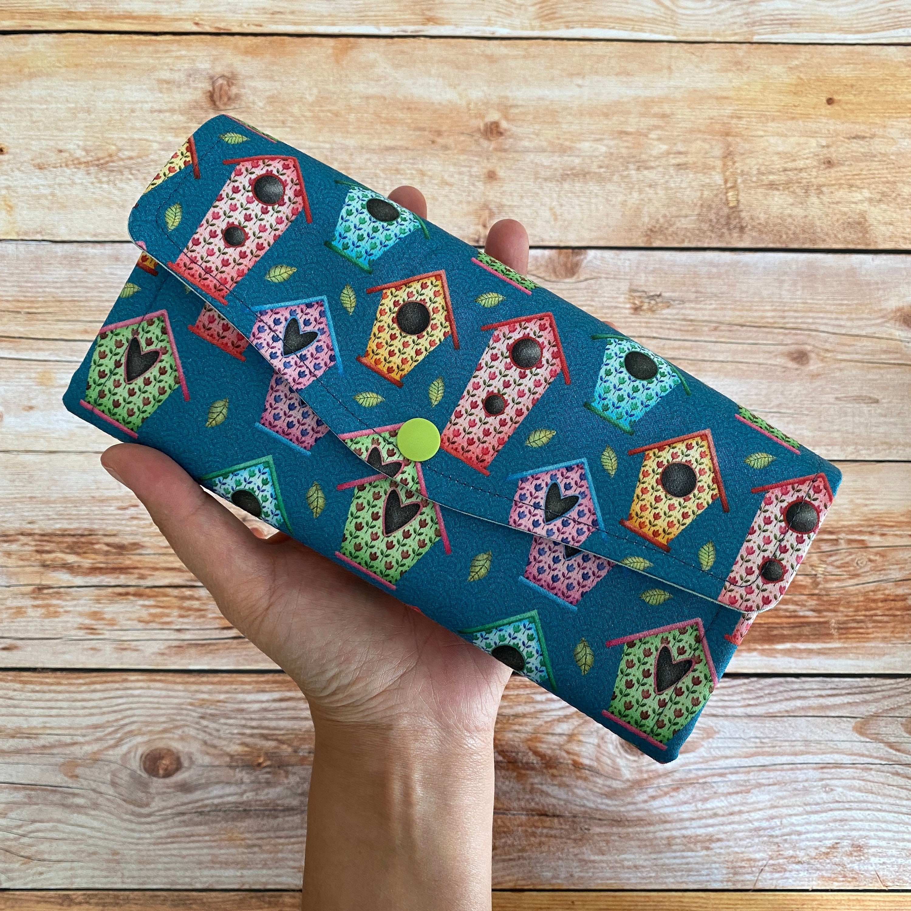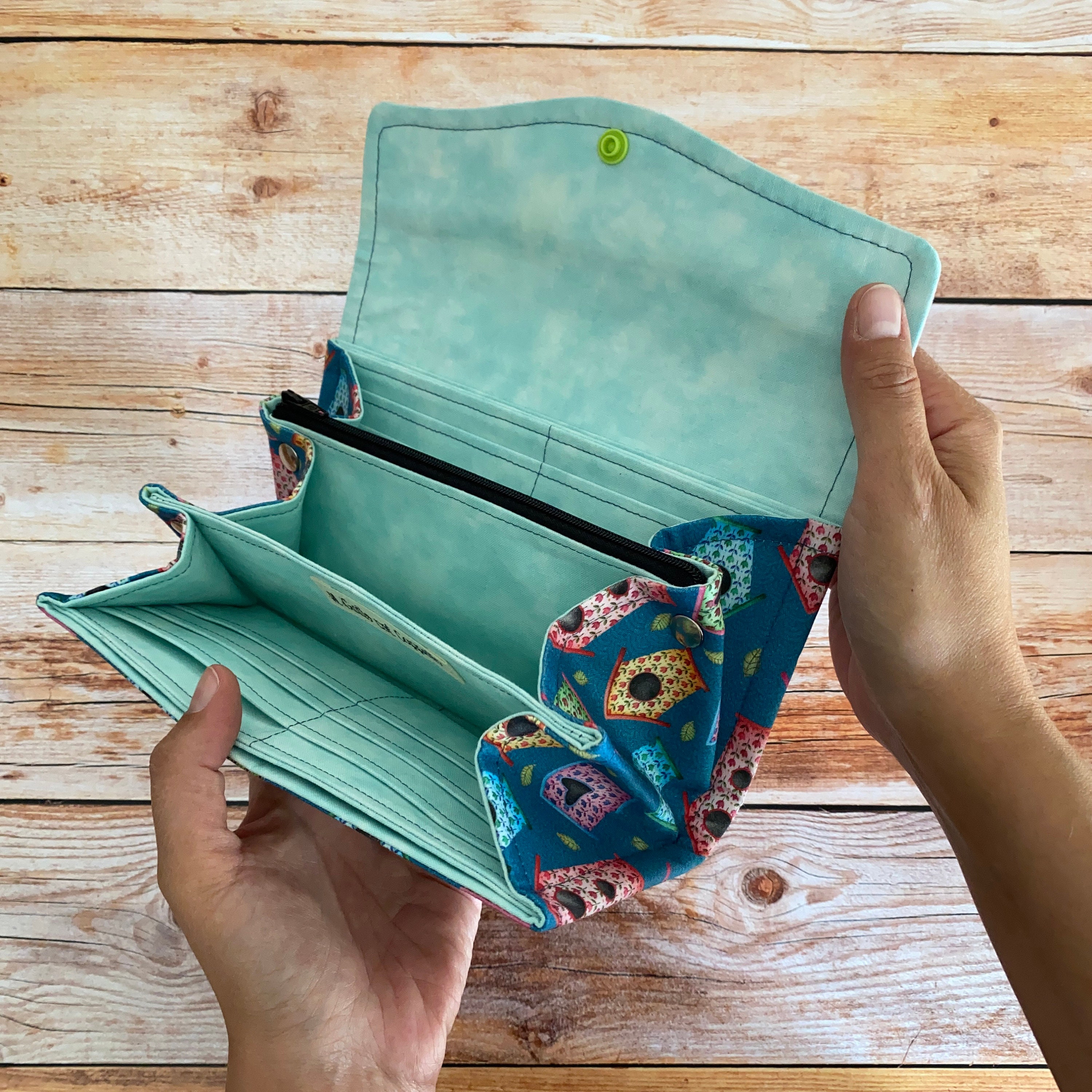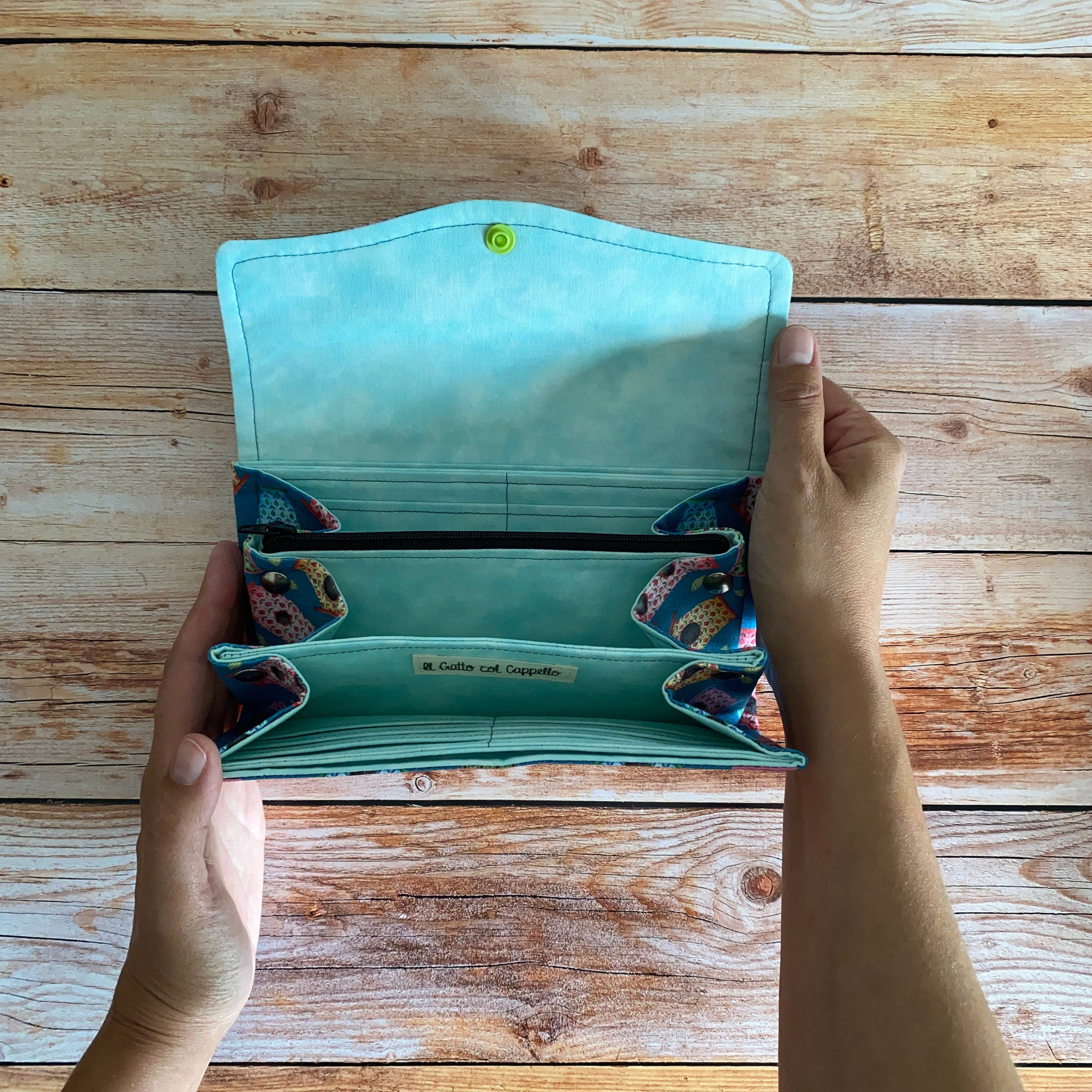 L'esterno del portafogli è realizzato in raso di cotone con stampa casette, l'interno in tessuto di cotone azzurro