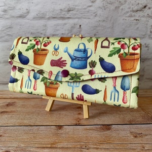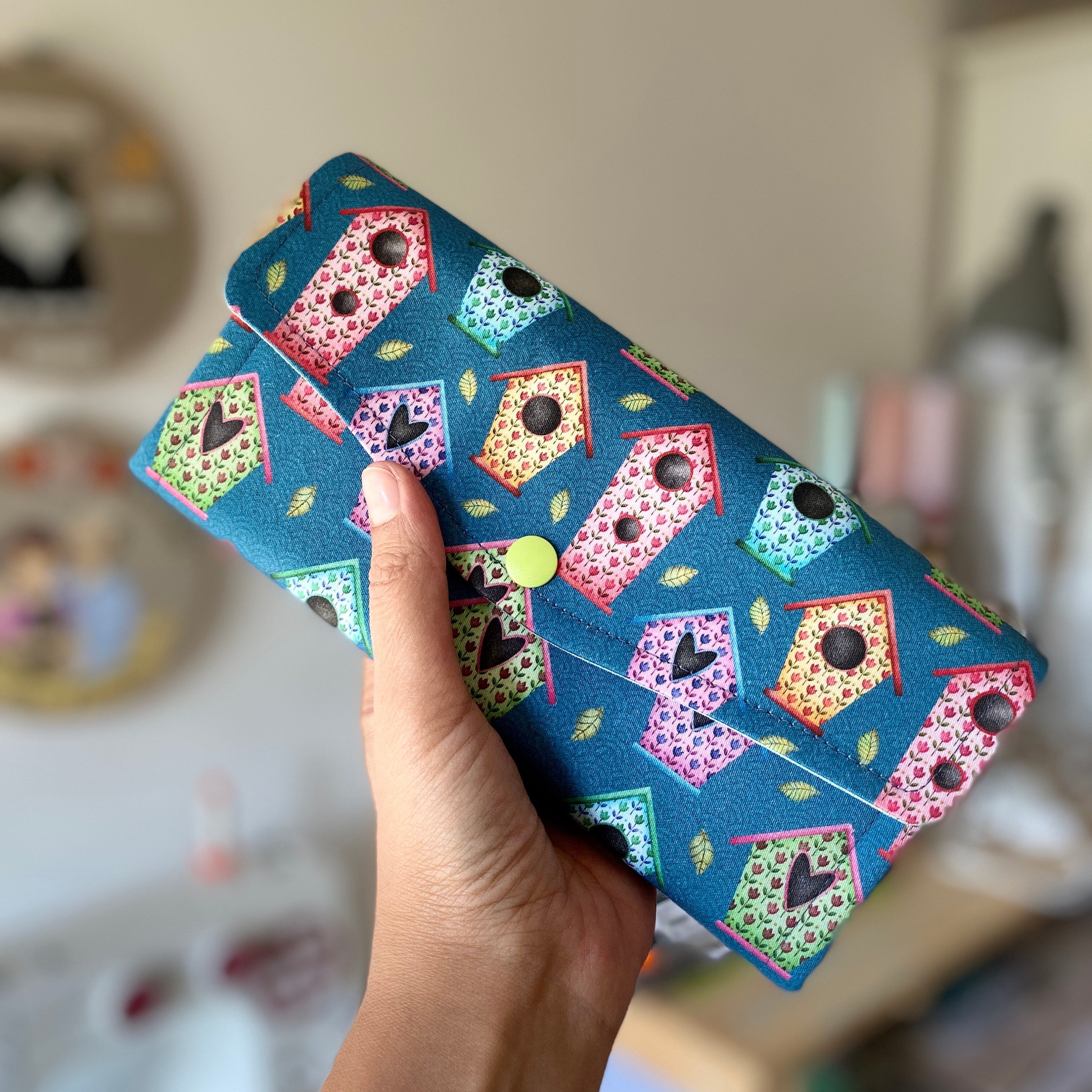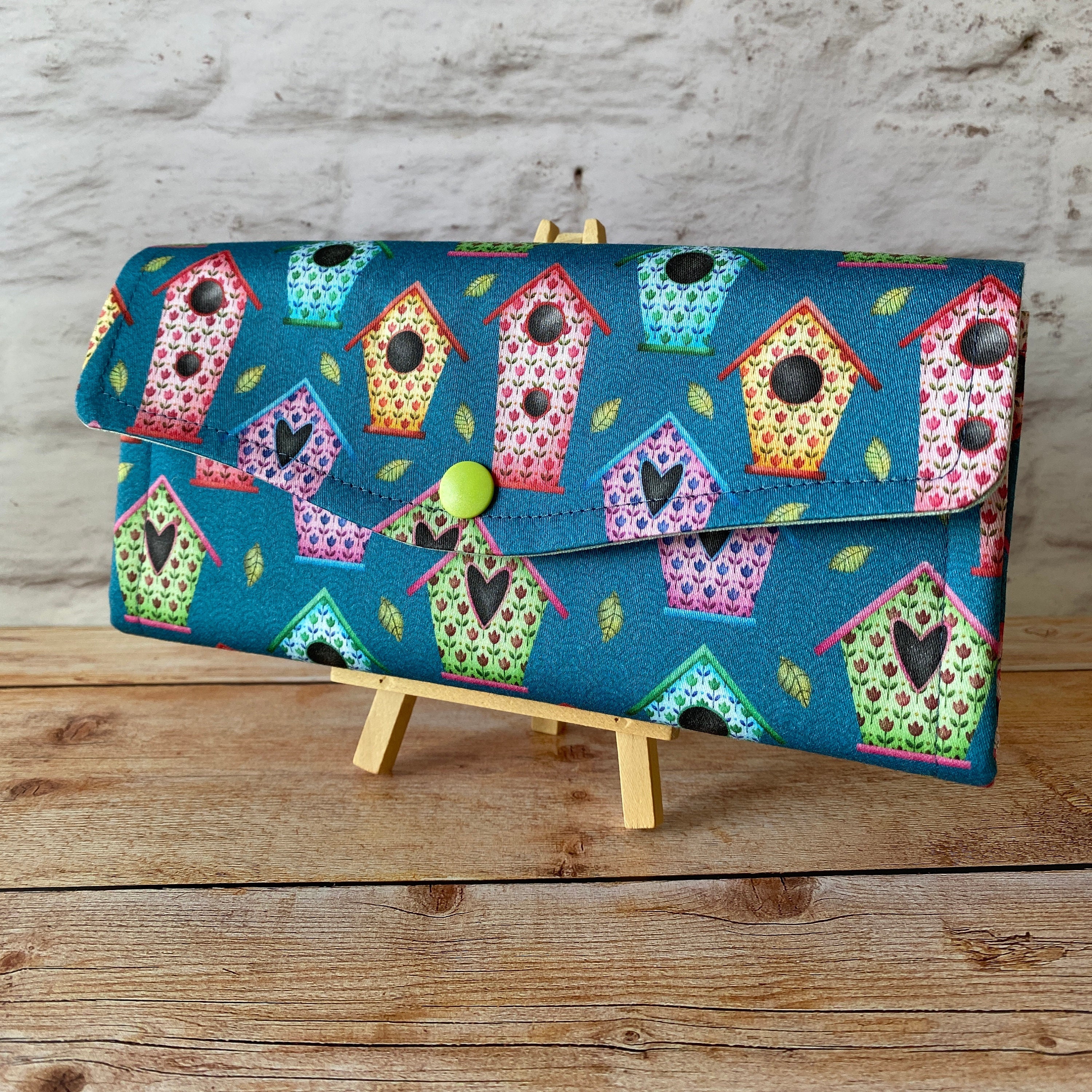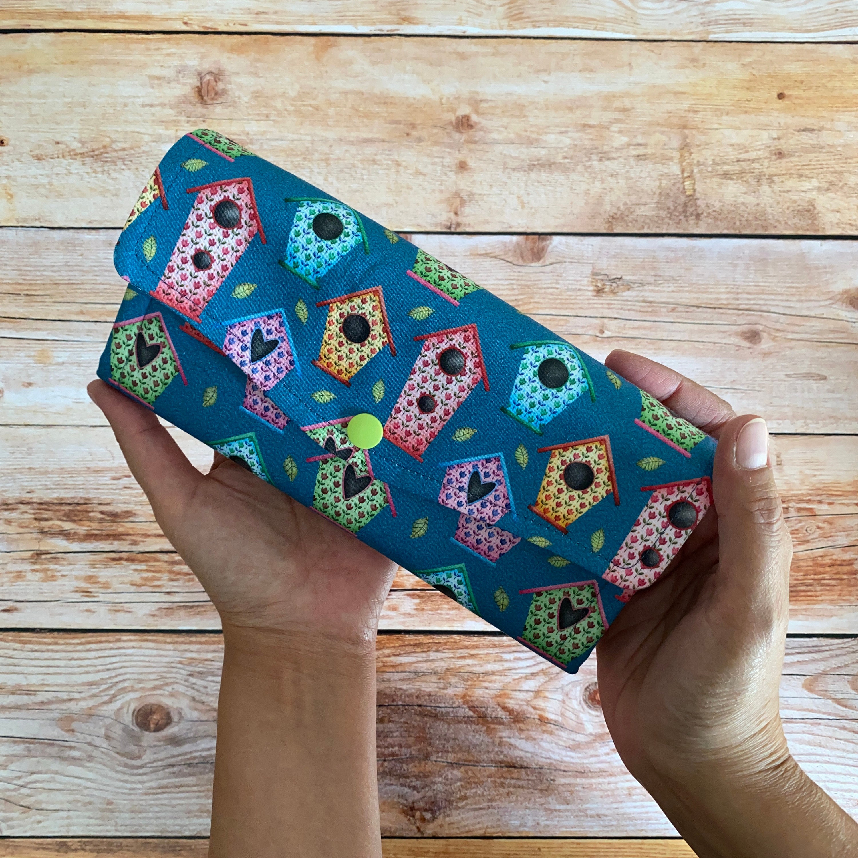 L'esterno del portafogli è realizzato in raso di cotone con stampa casette, l'interno in tessuto di cotone azzurro