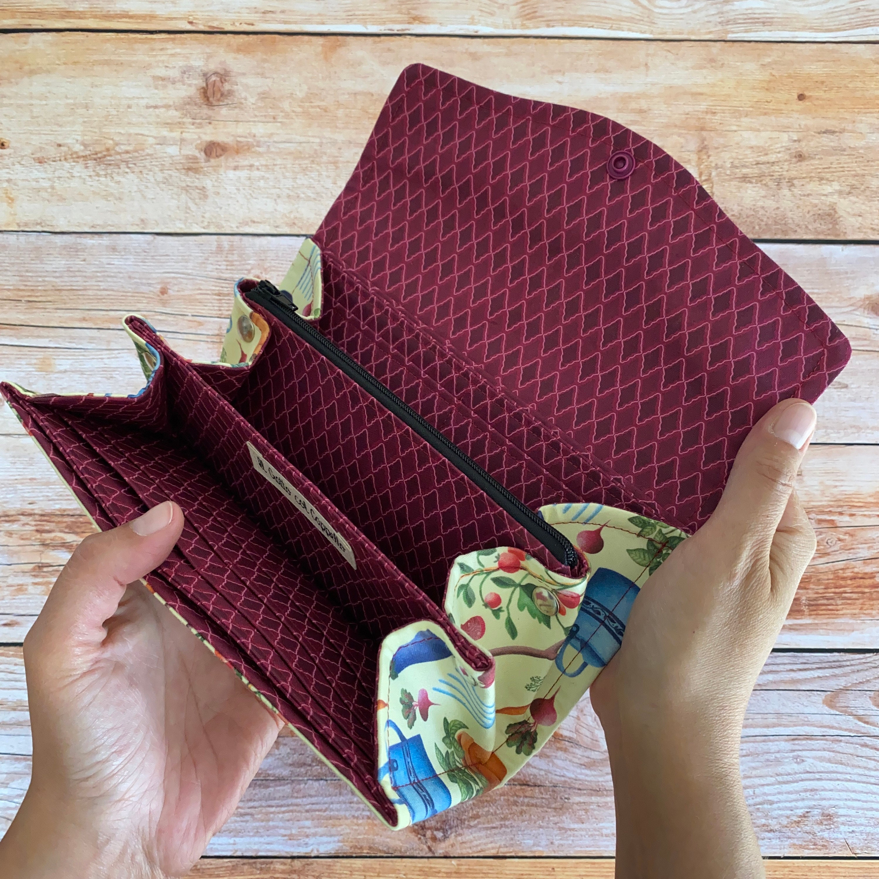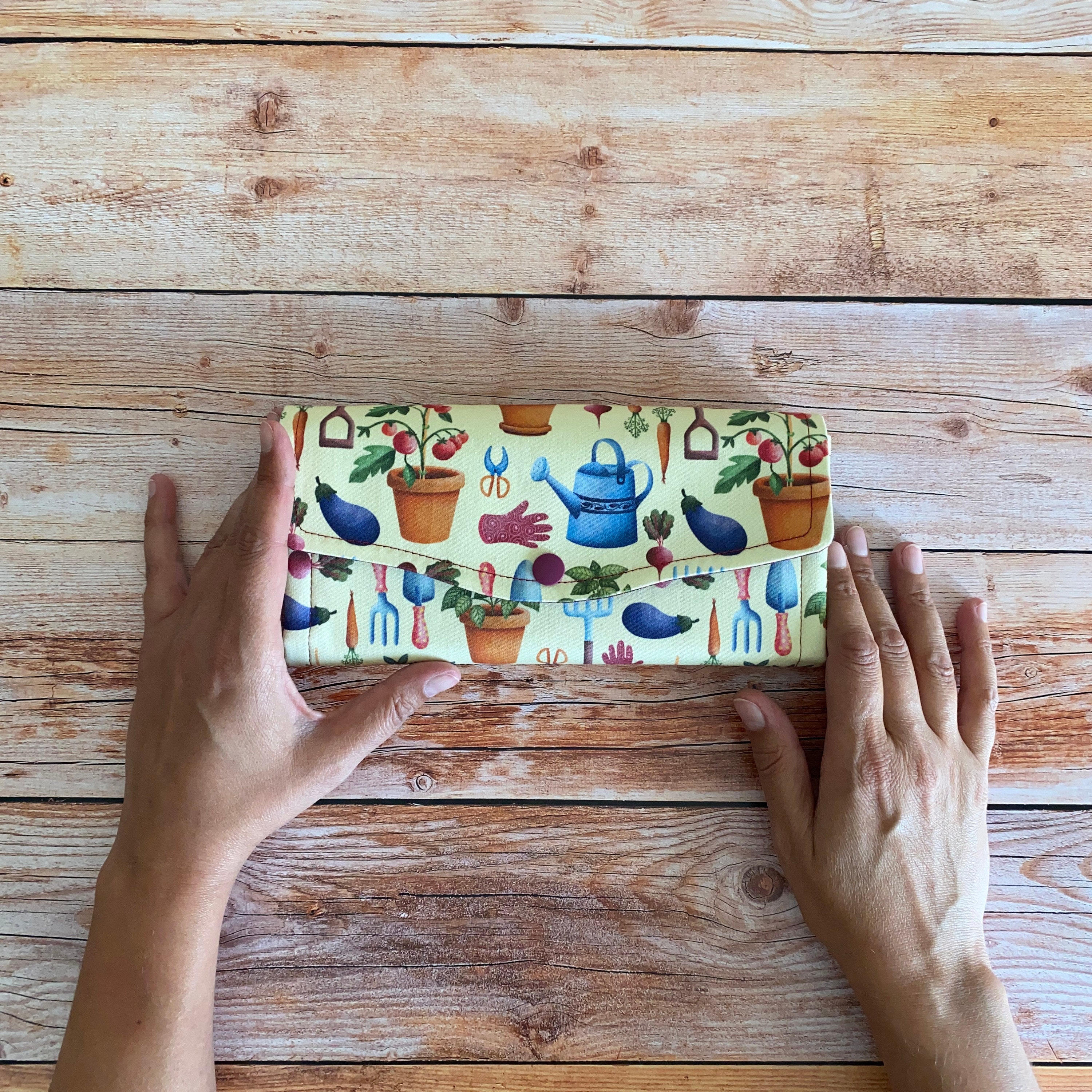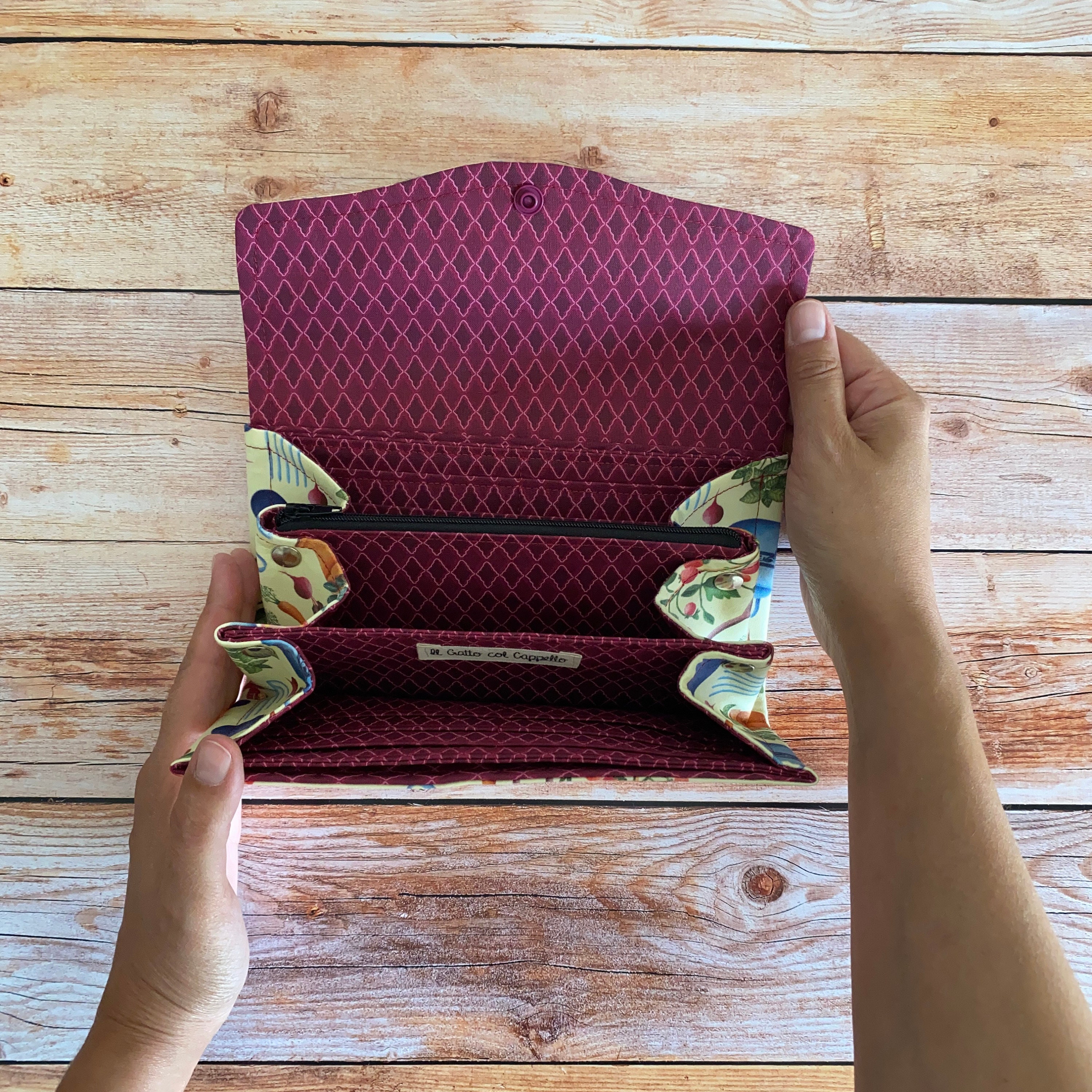 L'esterno del portafogli è realizzato in raso di cotone con stampa giardinaggio, l'interno in tessuto di cotone vinaccia
