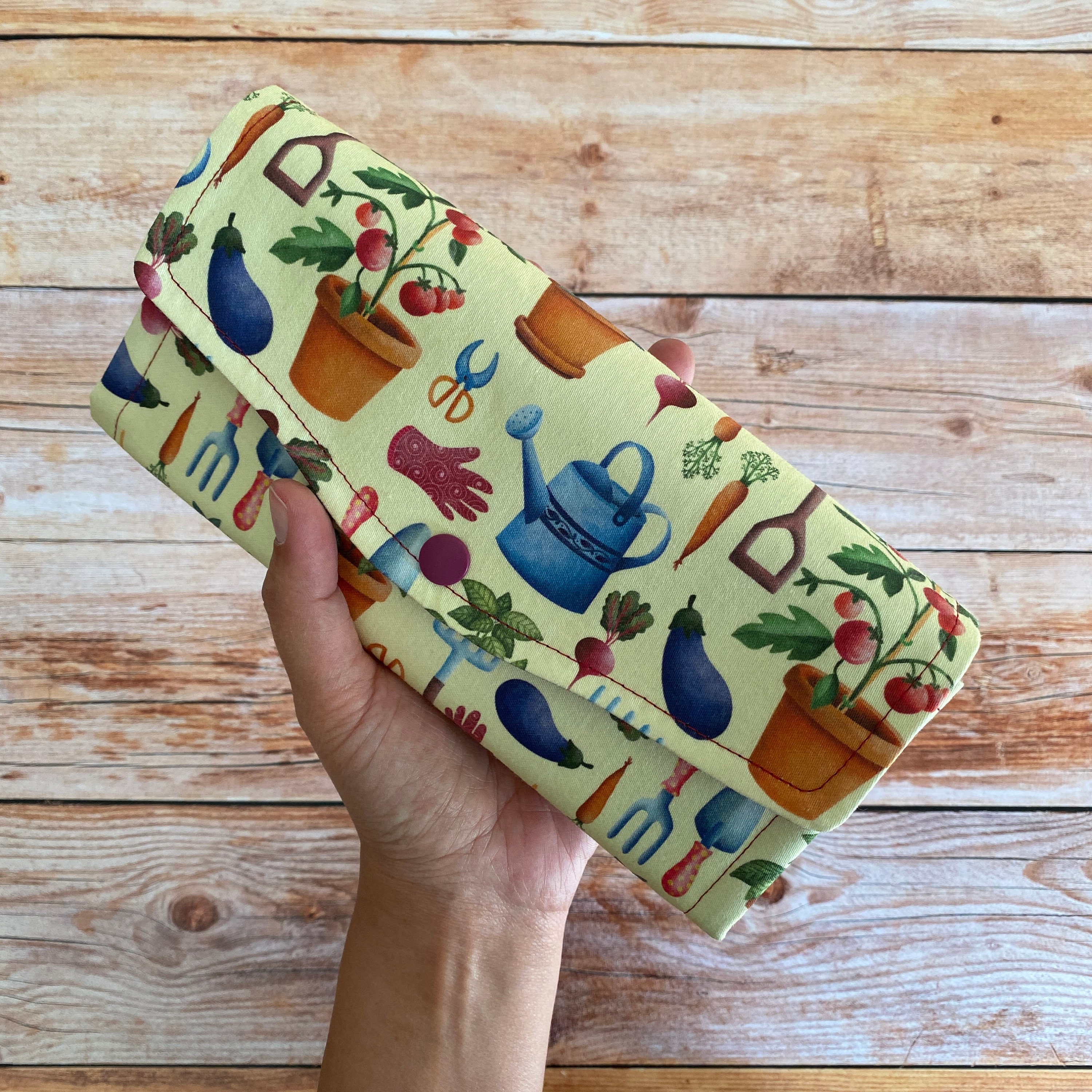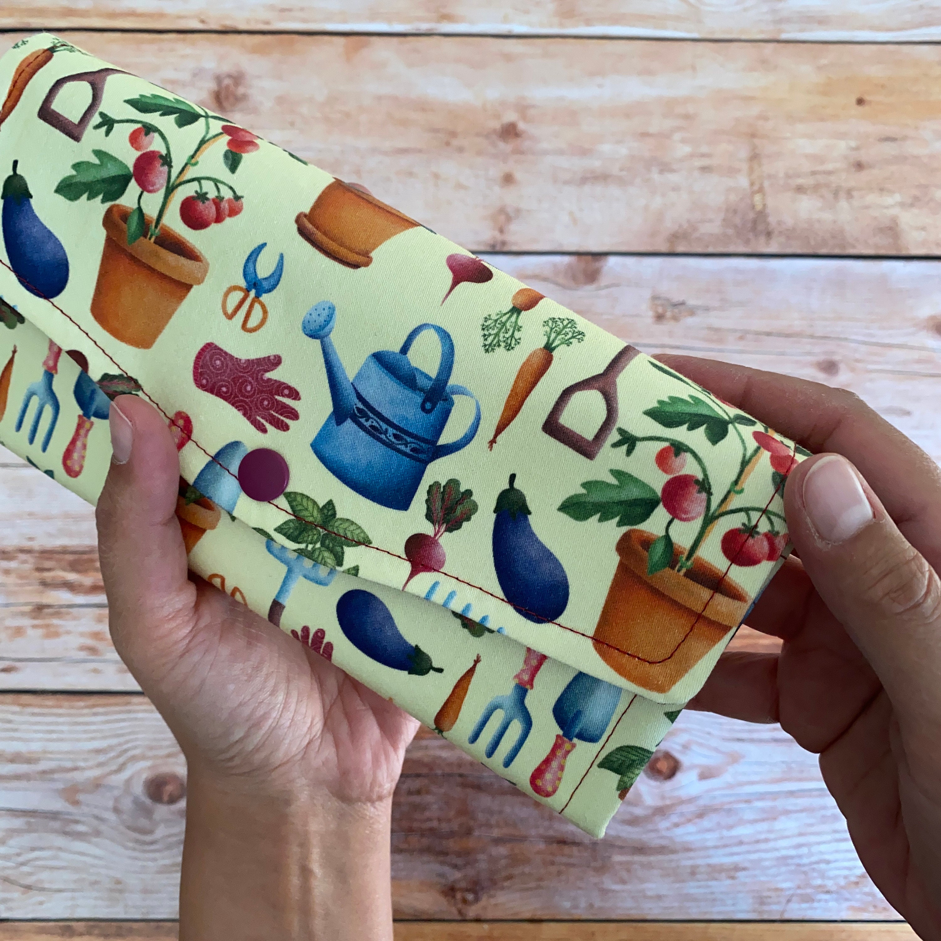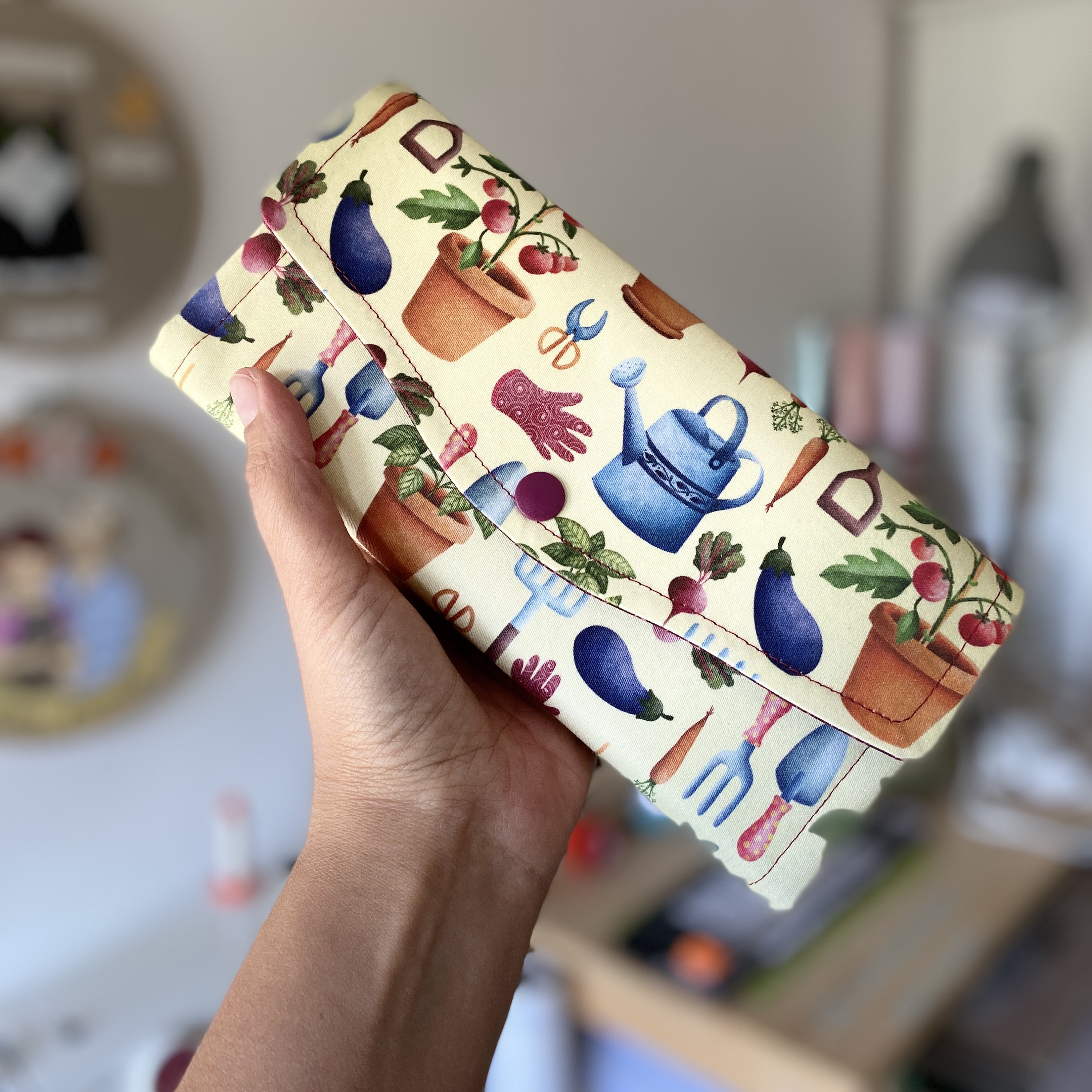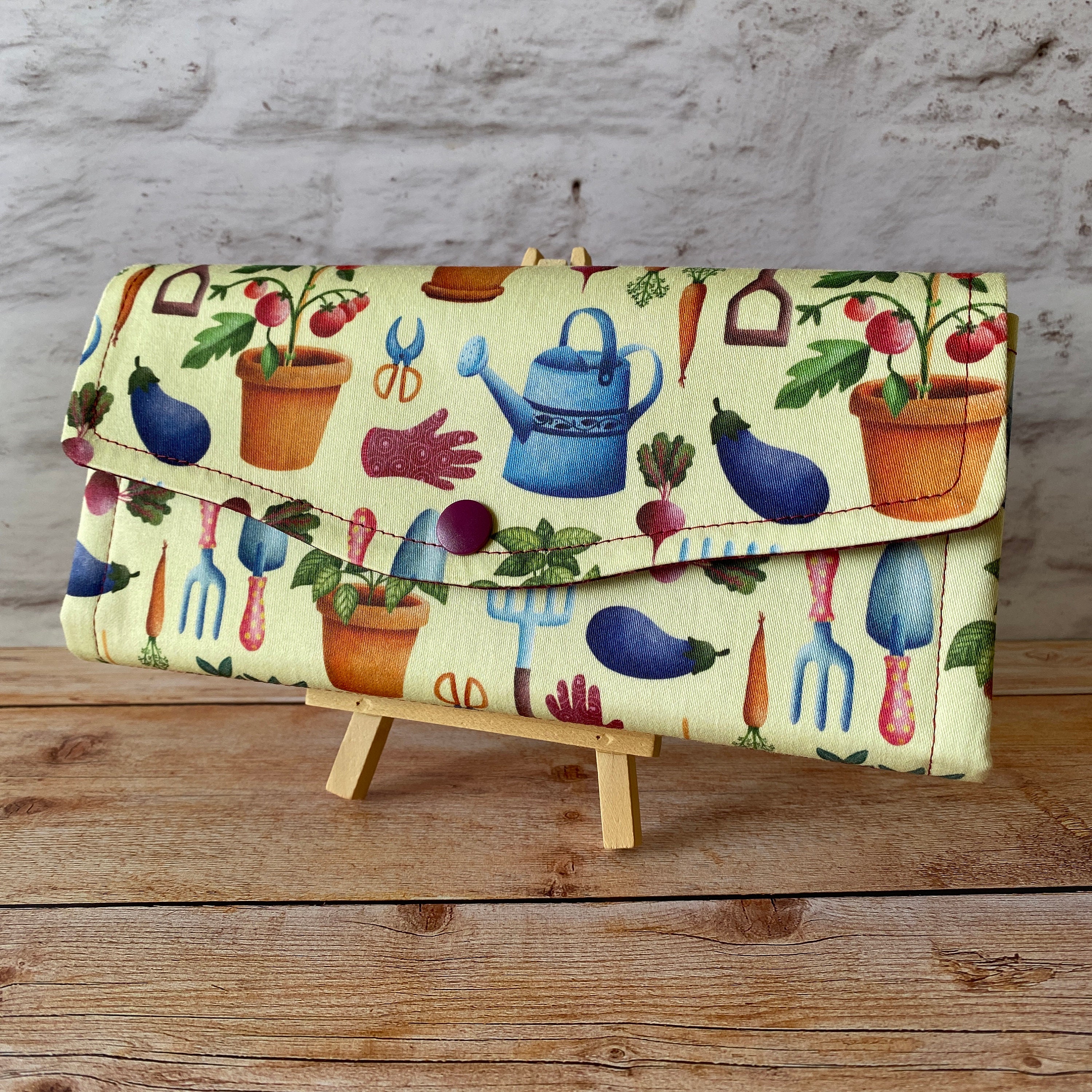 L'esterno del portafogli è realizzato in raso di cotone con stampa giardinaggio, l'interno in tessuto di cotone vinaccia