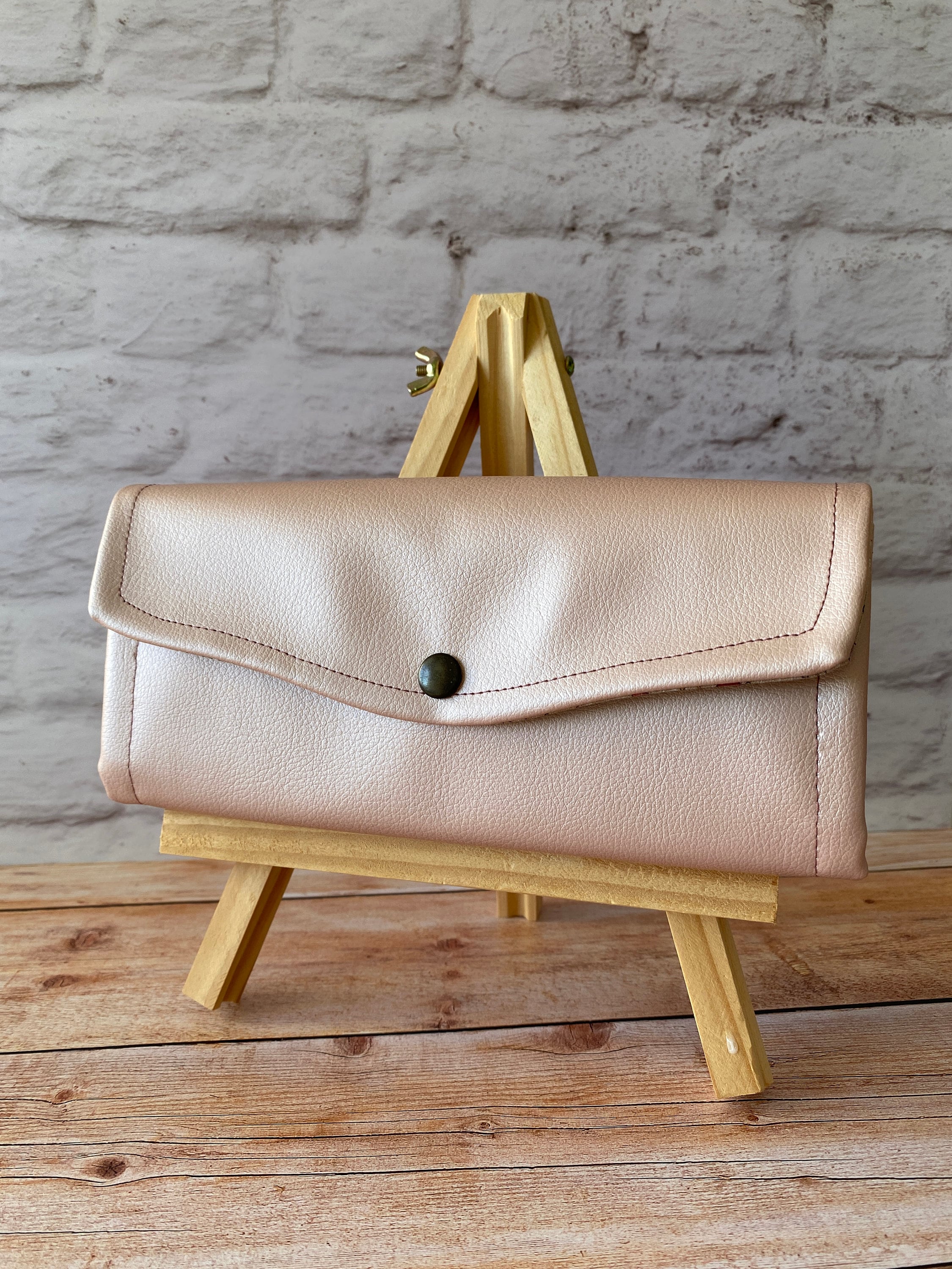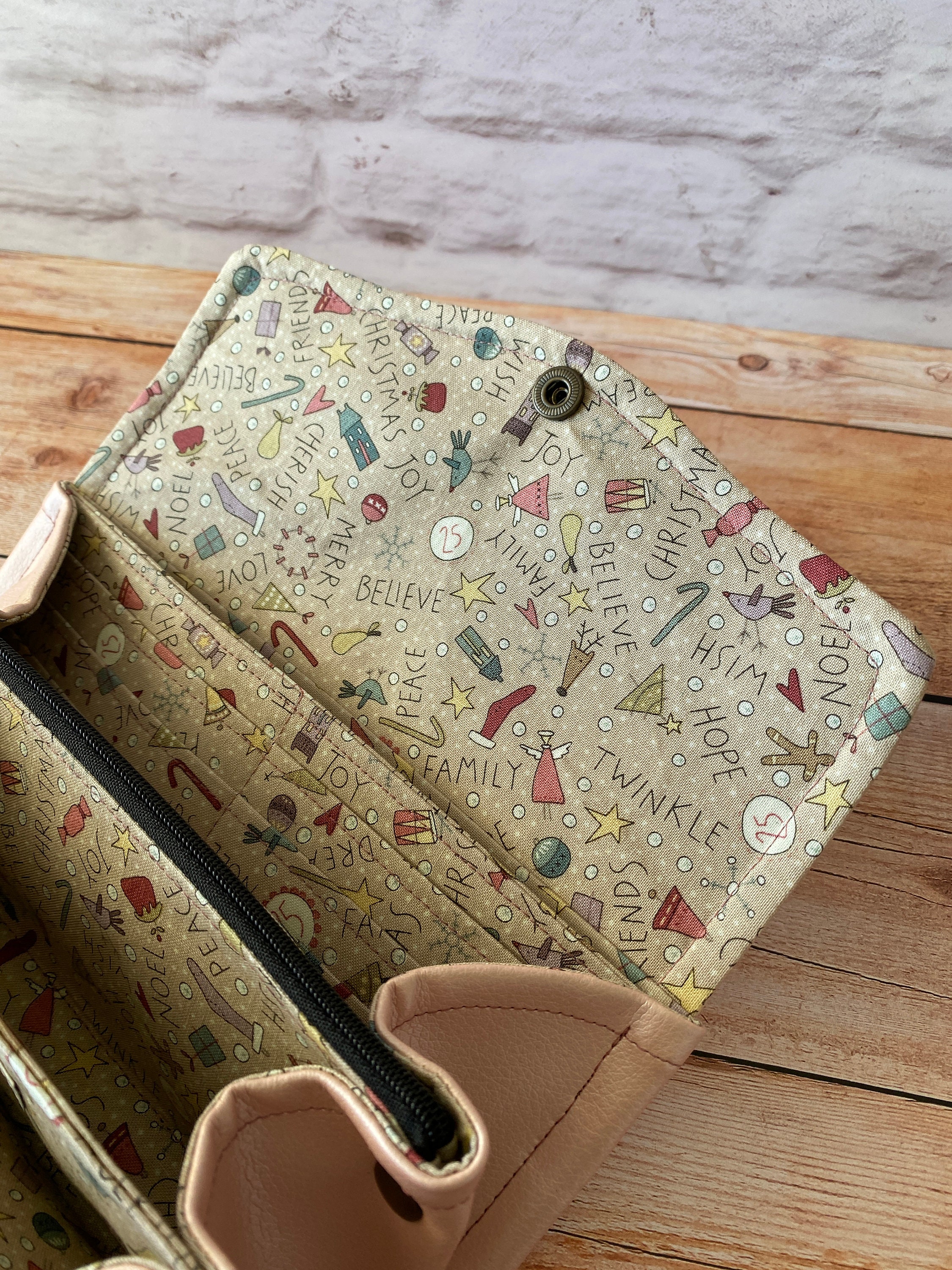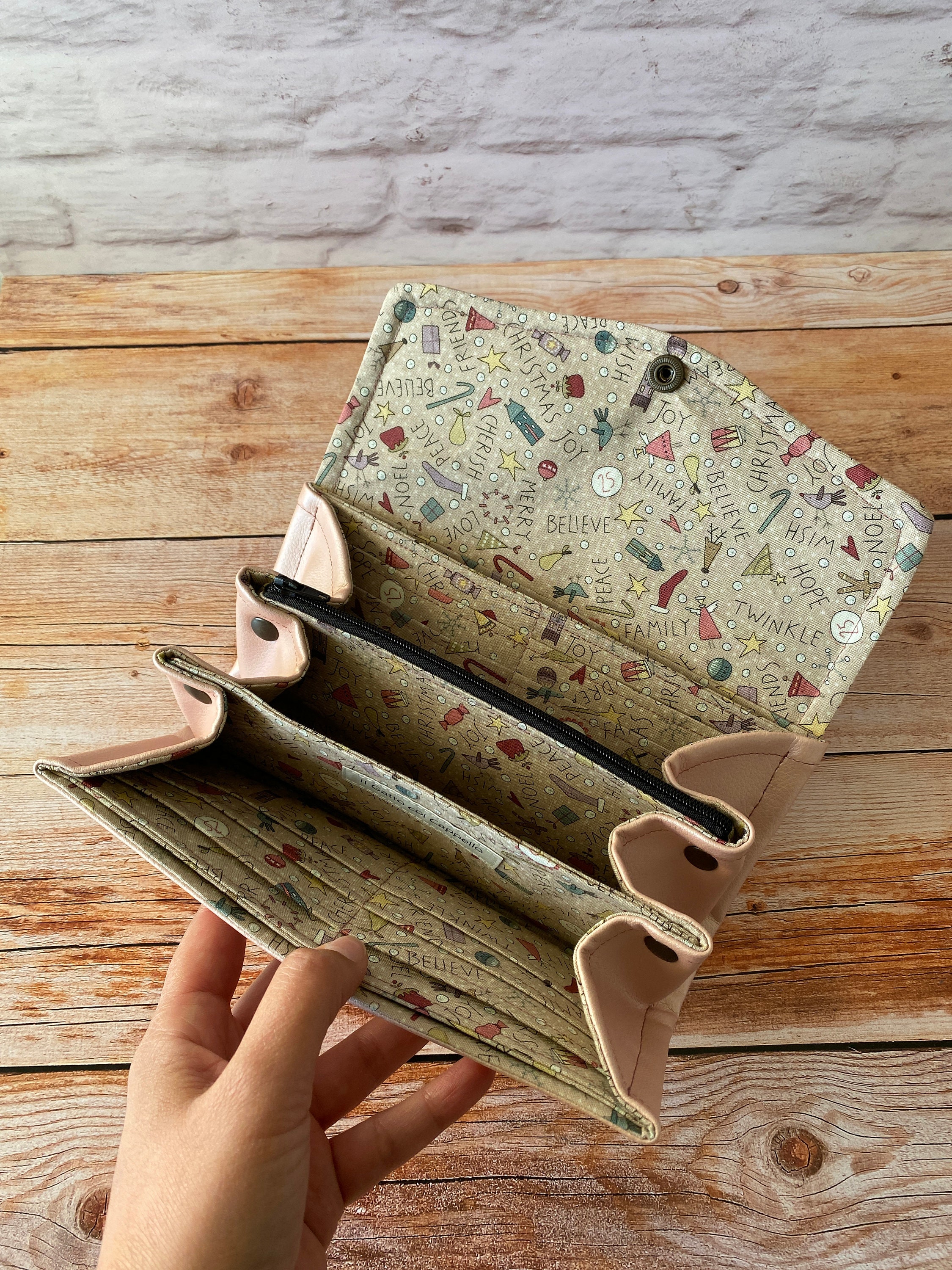 Portafogli realizzato in morbidissima simil pelle rosa perlato, interno in tessuto di cotone fantasia Natale