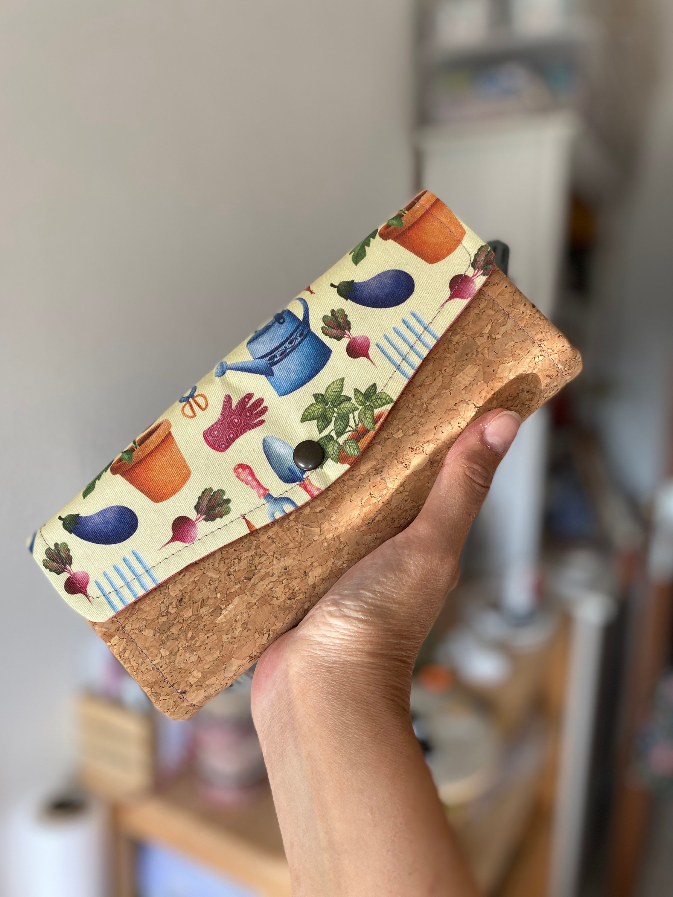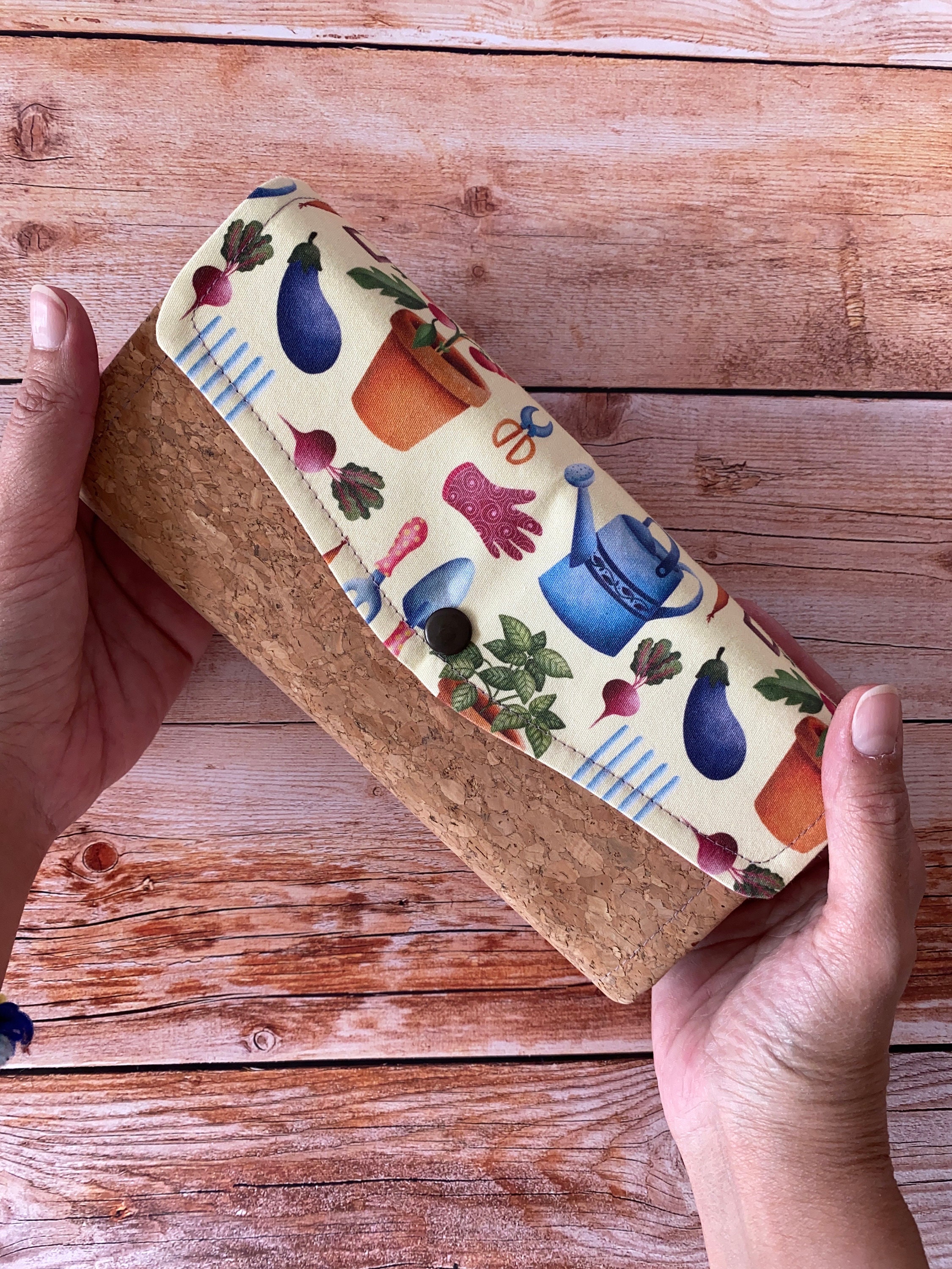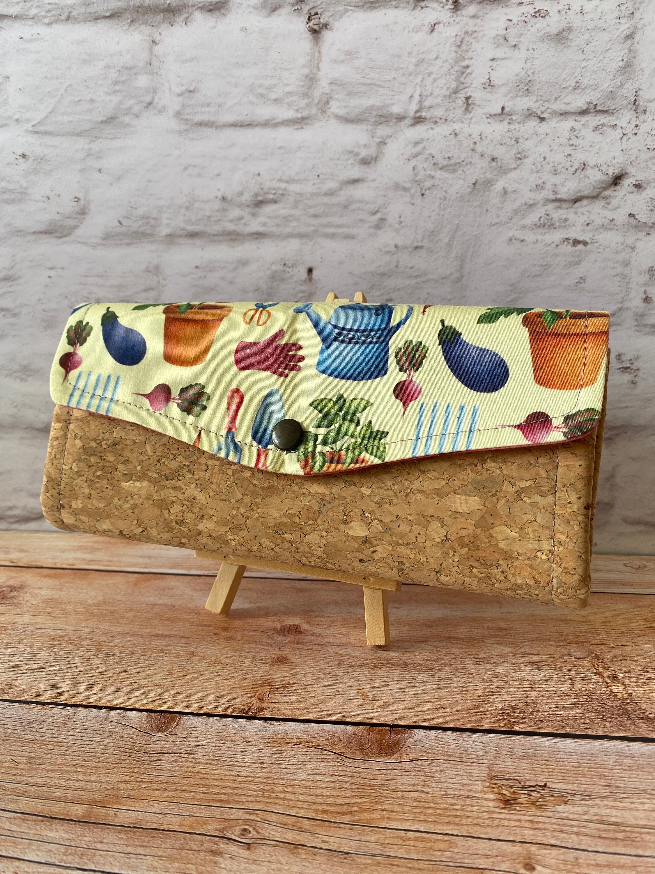 Portafogli grande in sughero e raso di cotone, stampa giardinaggio