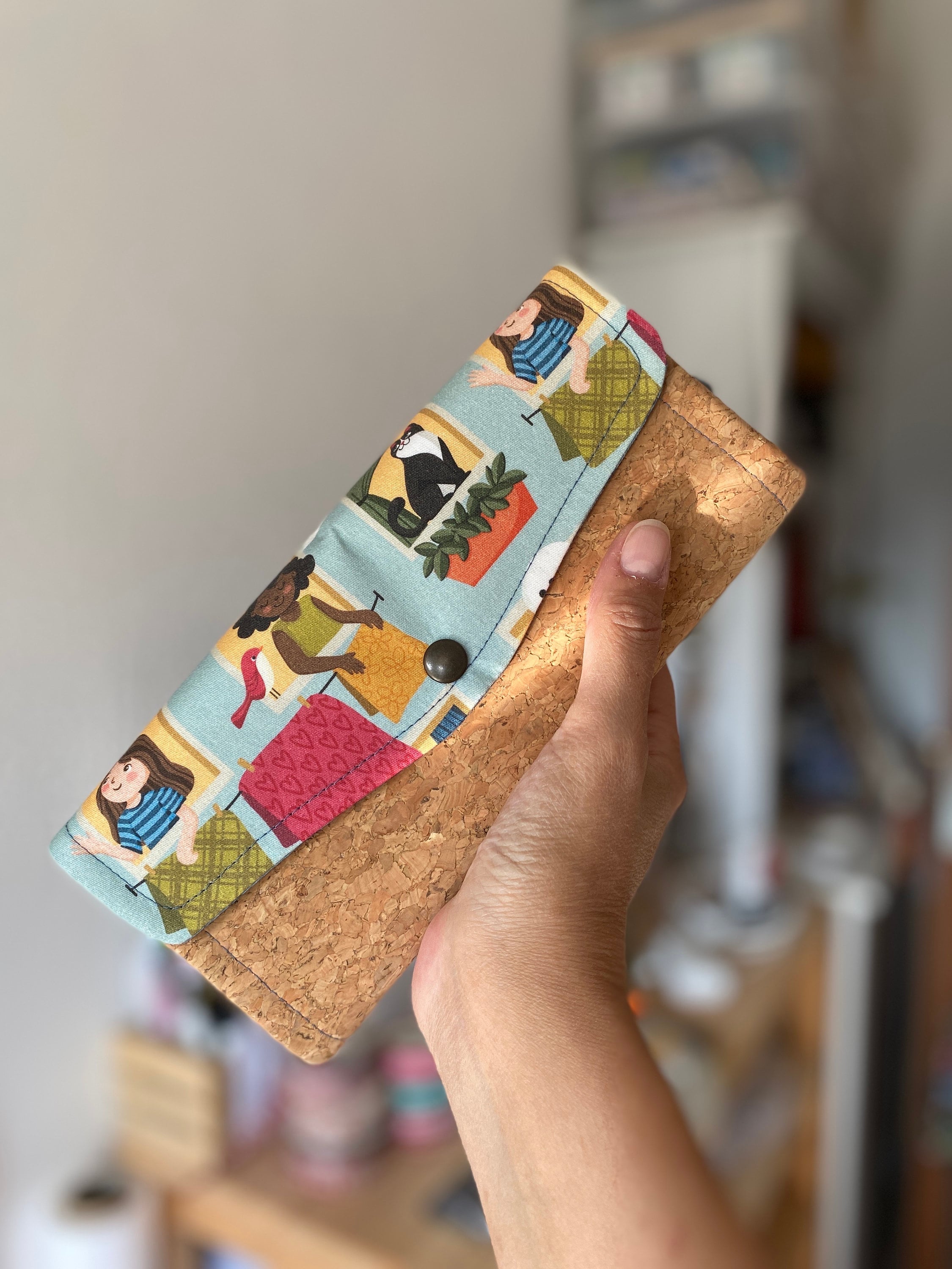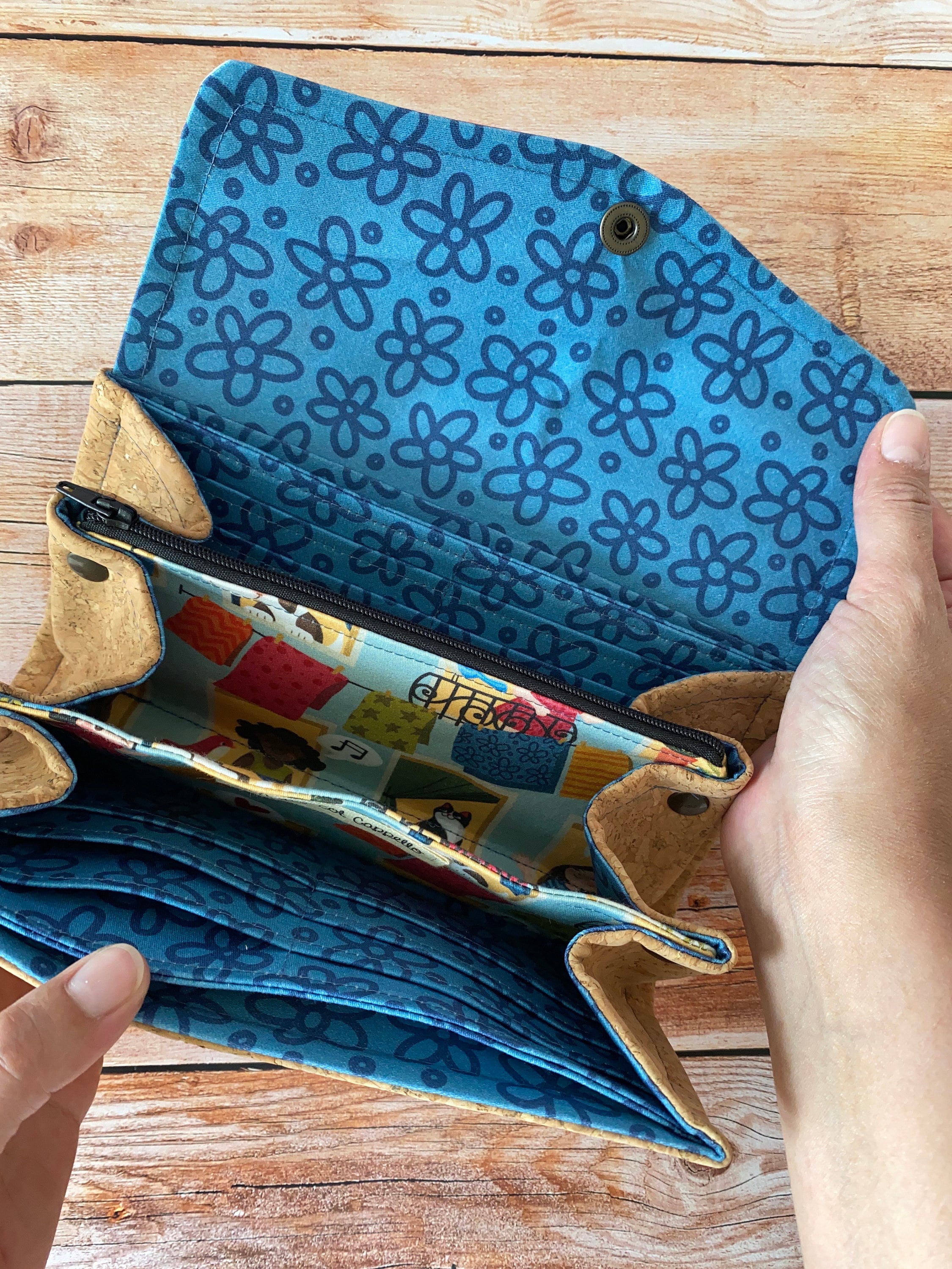 L'esterno del portafogli è realizzato in tessuto di sughero e raso di cotone, l'interno in tessuto di cotone