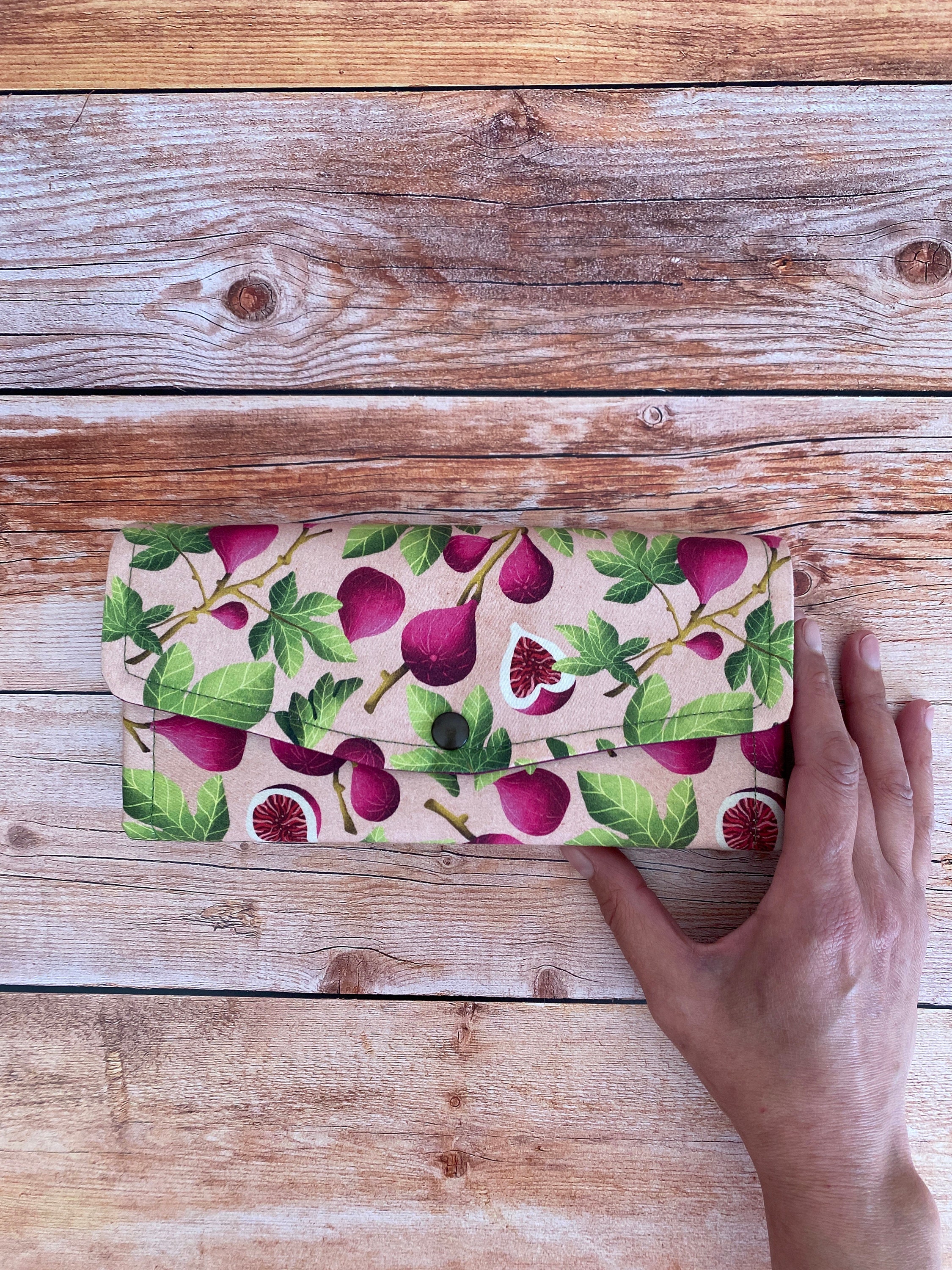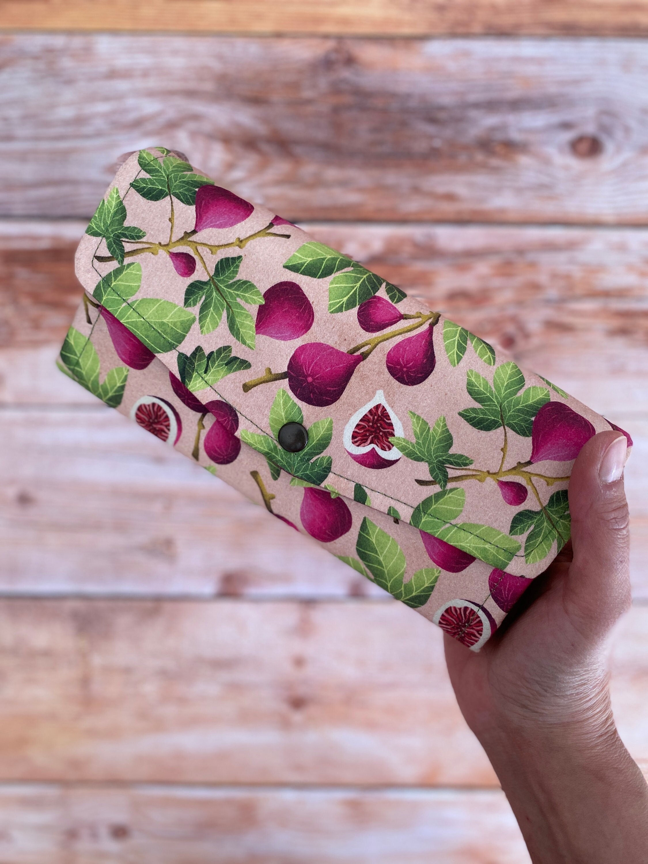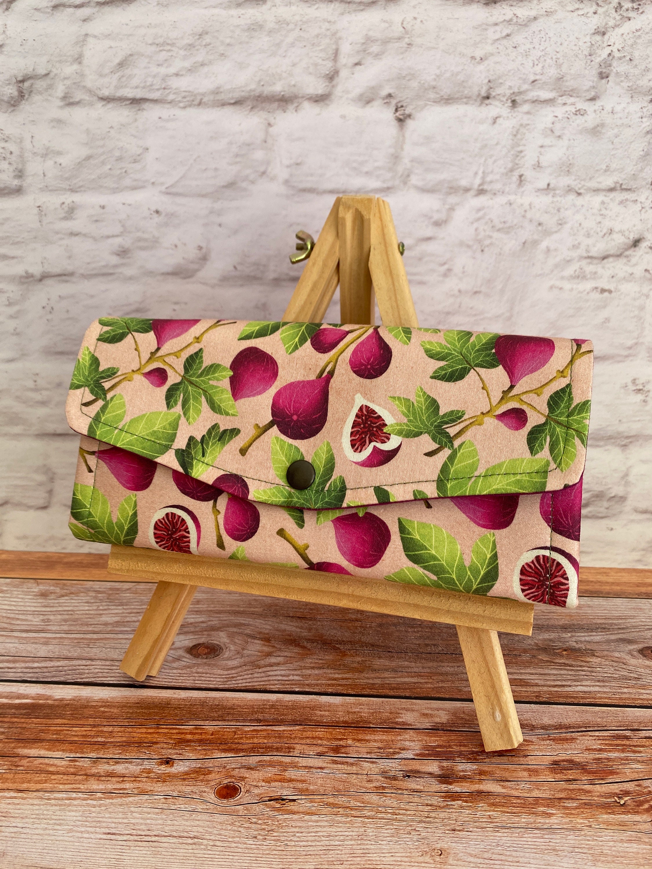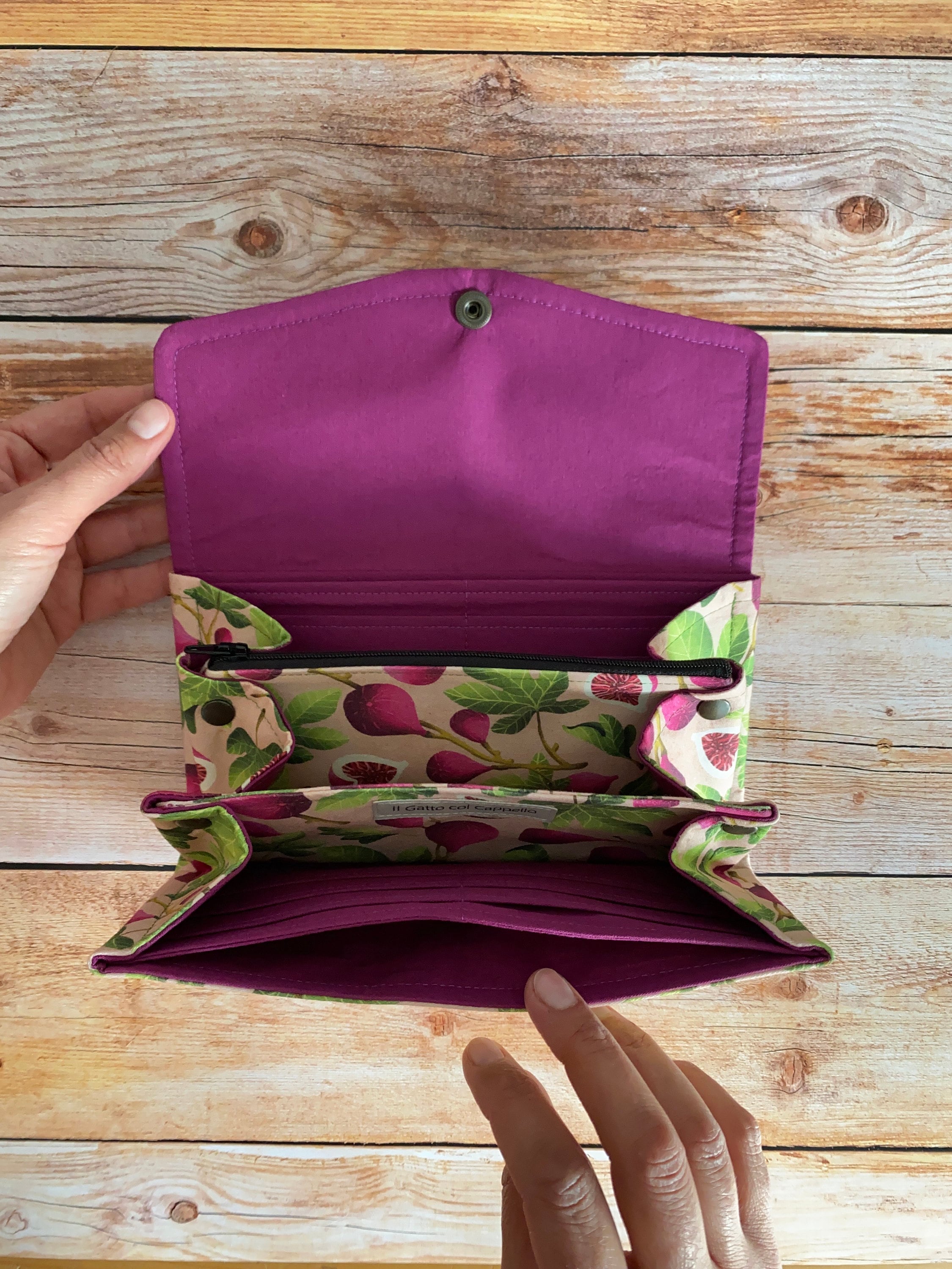 L'esterno del portafogli è realizzato in raso di cotone con stampa fichi su fondo rosa antico, l'interno in tessuto di cotone color orchidea