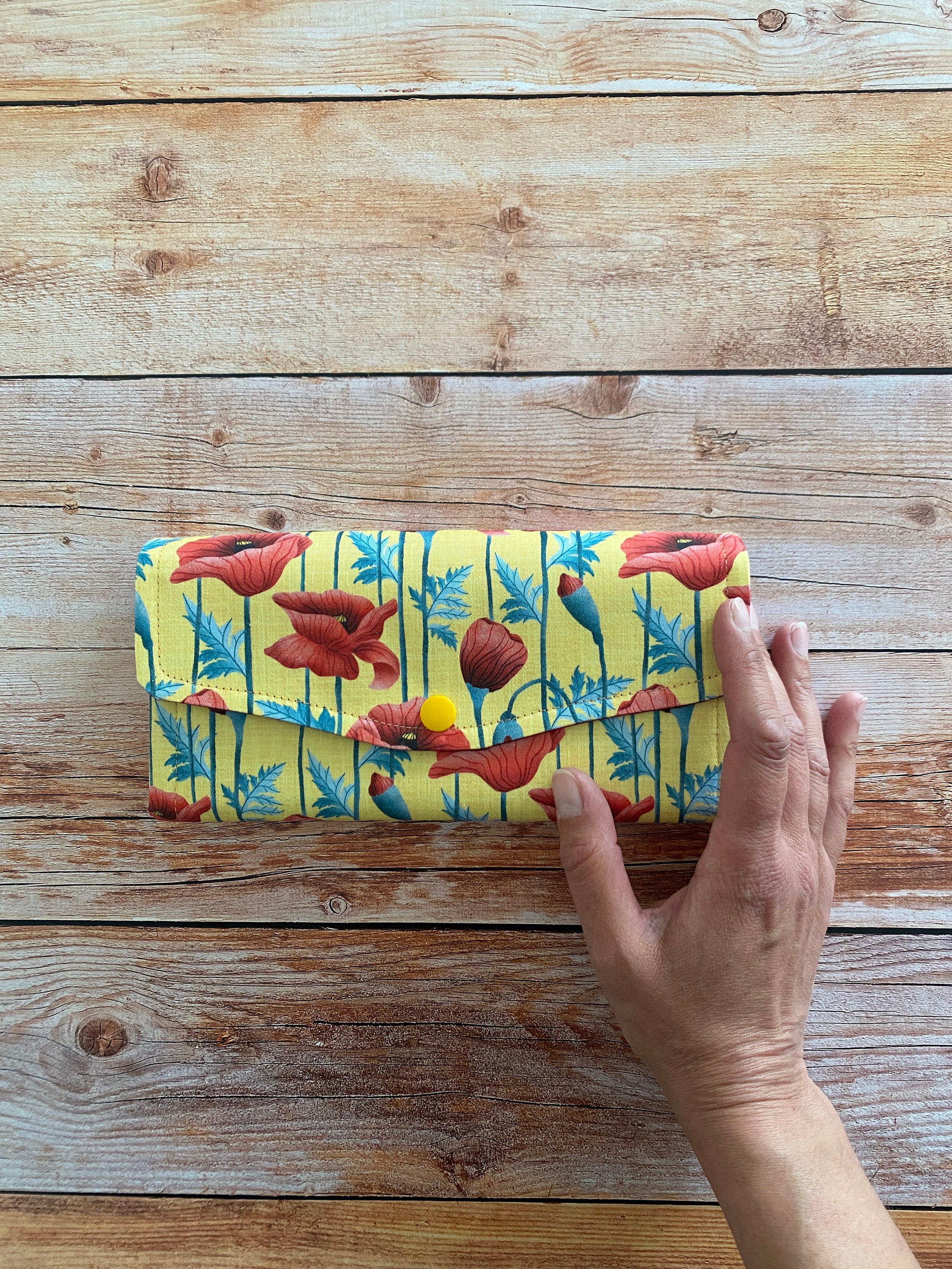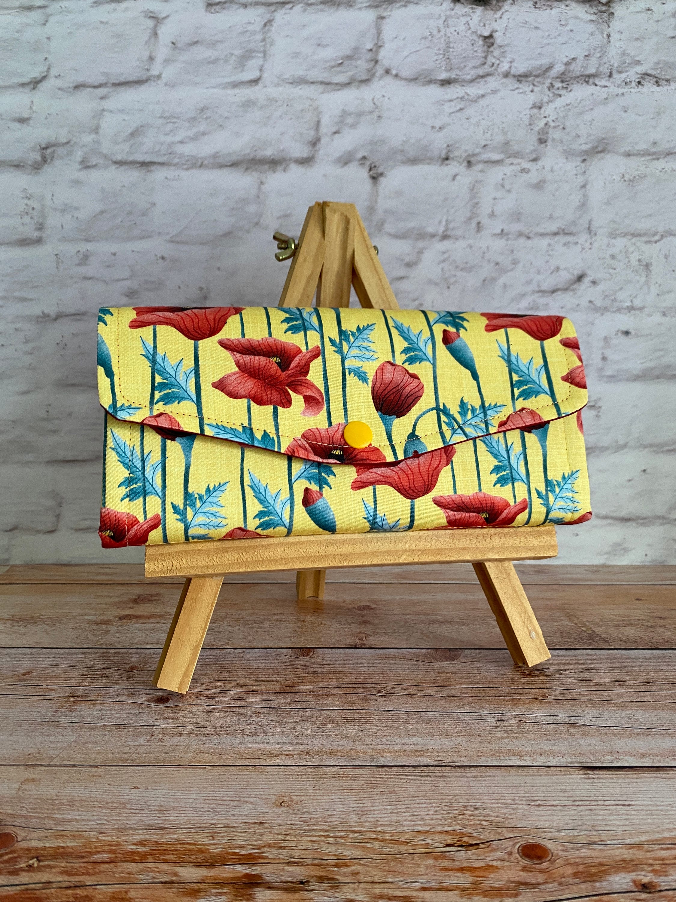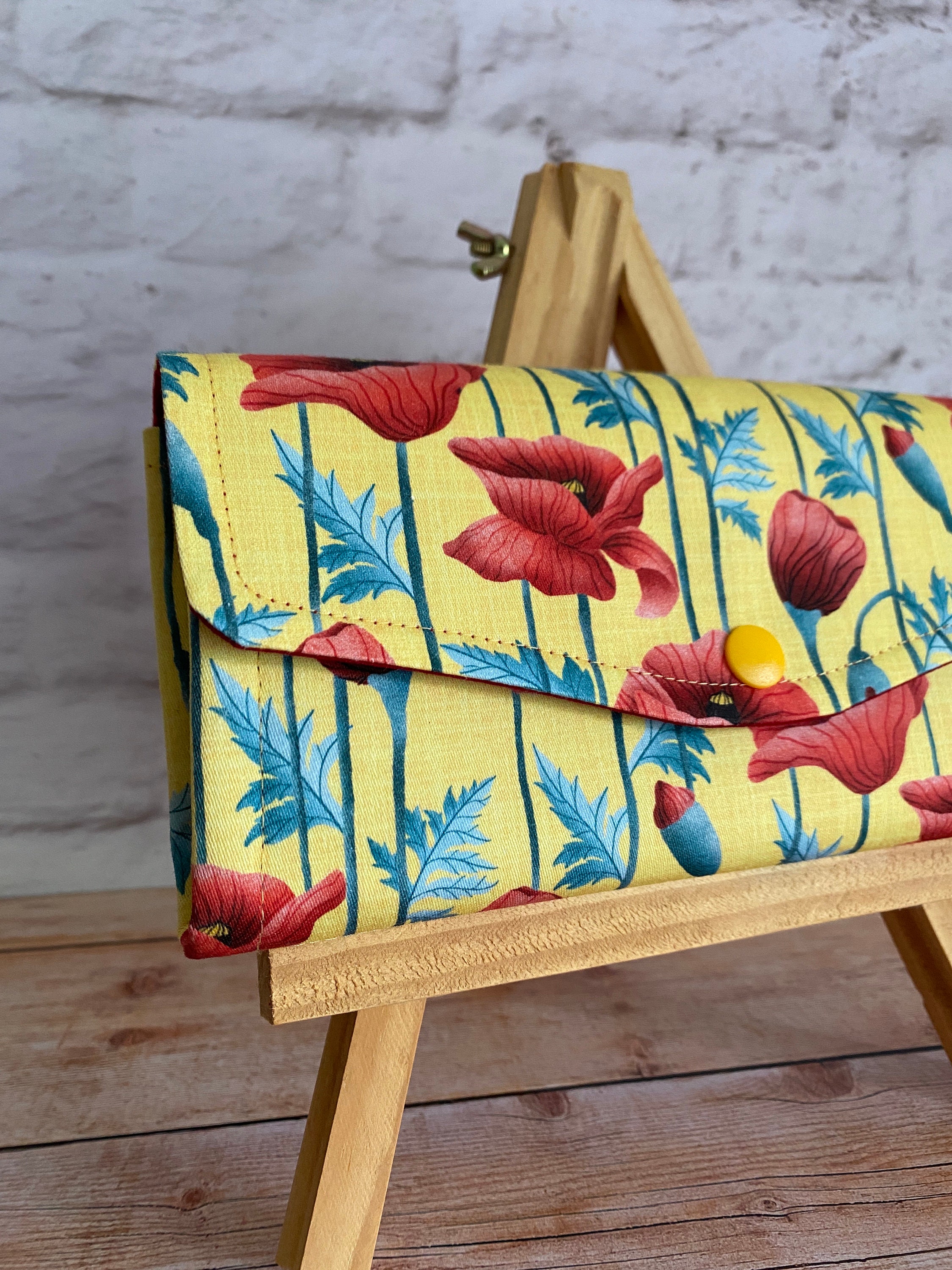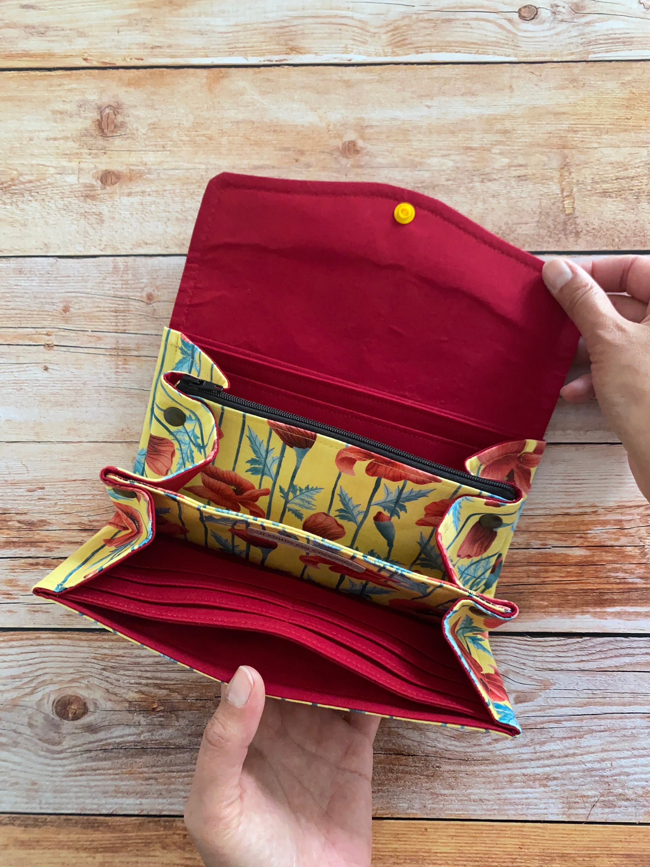 L'esterno del portafogli è realizzato in raso di cotone con stampa papaveri, l'interno in tessuto di cotone rosso