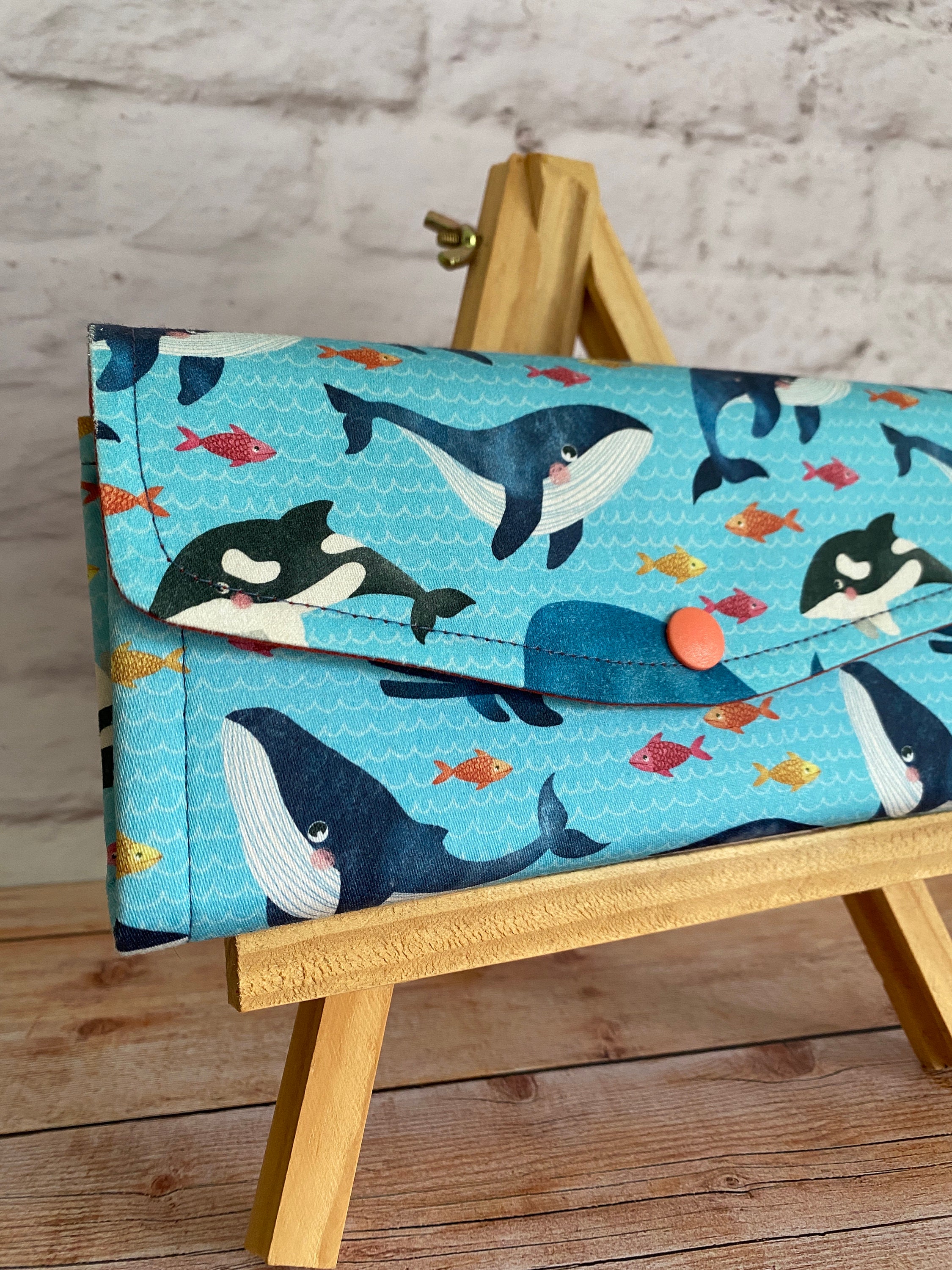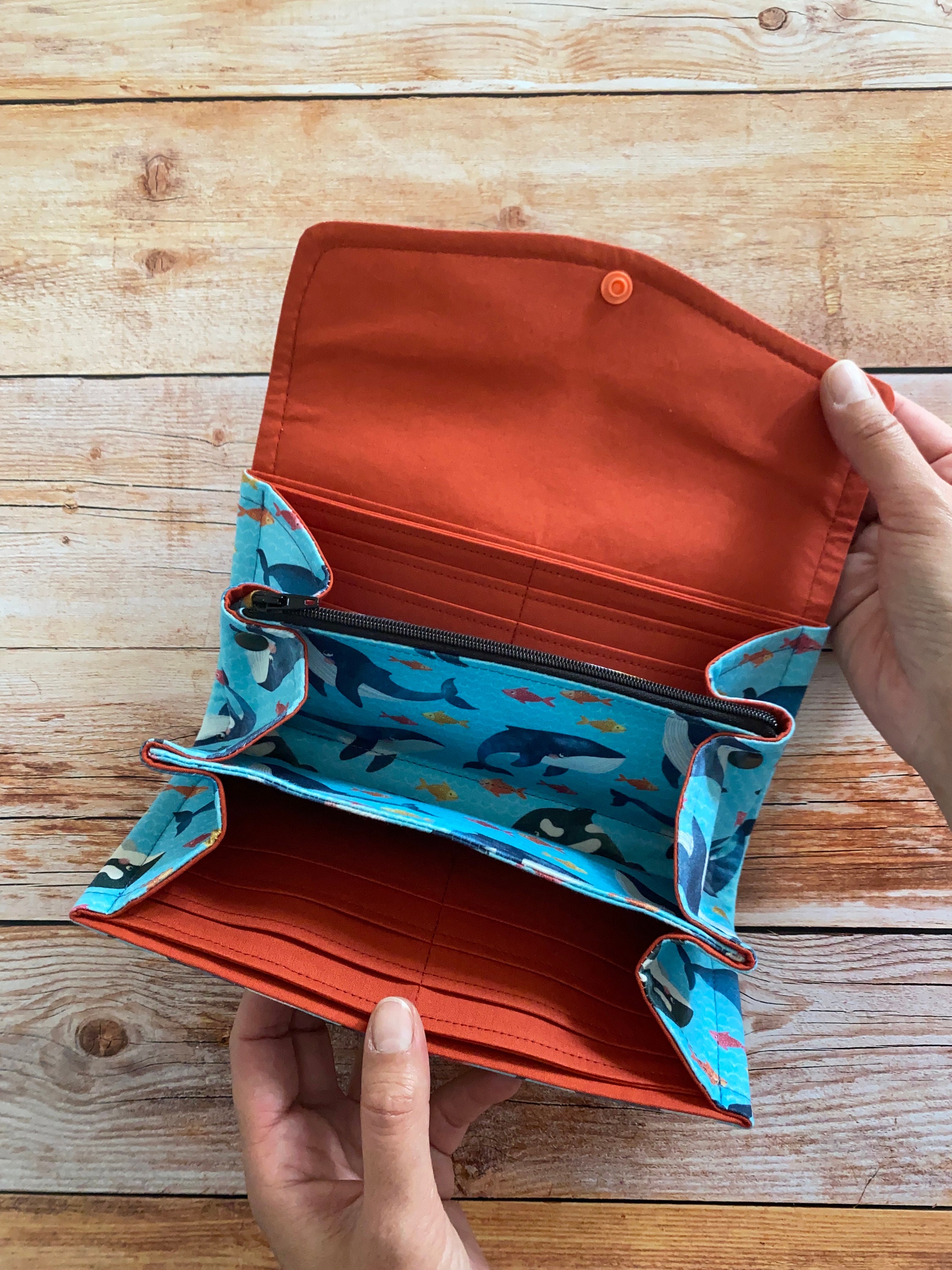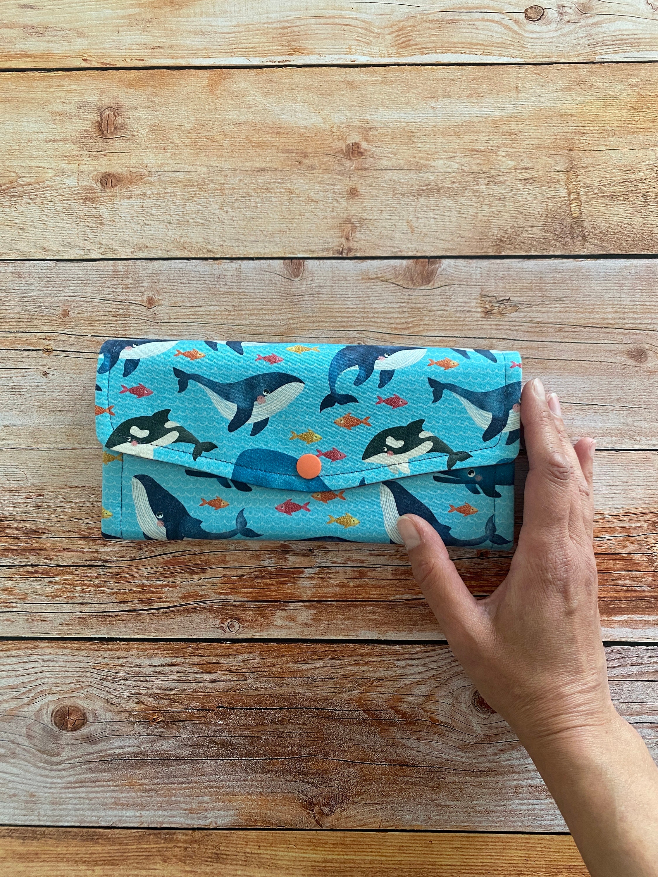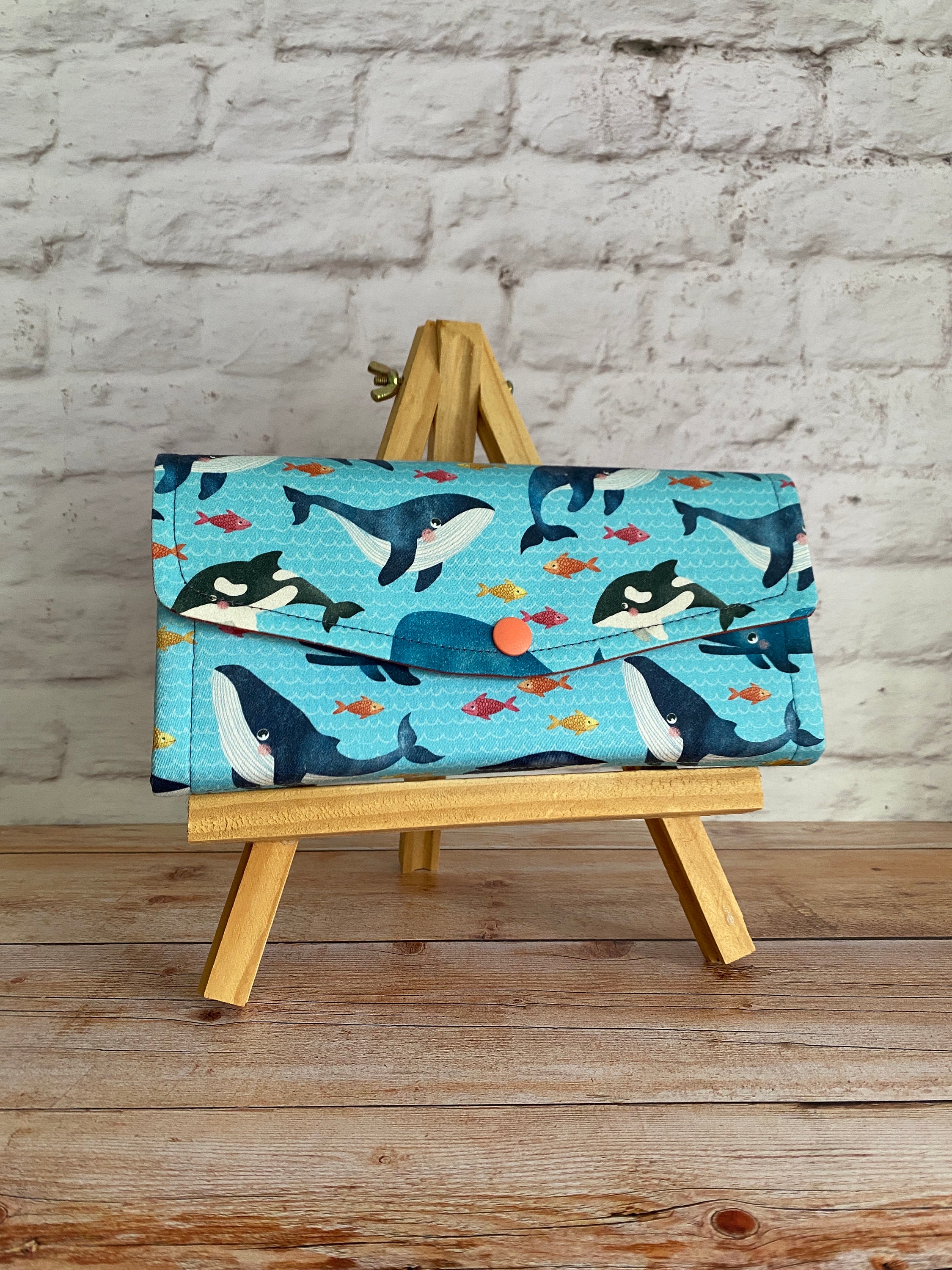 L'esterno del portafogli è realizzato in raso di cotone con stampa balene, l'interno in tessuto di cotone arancione